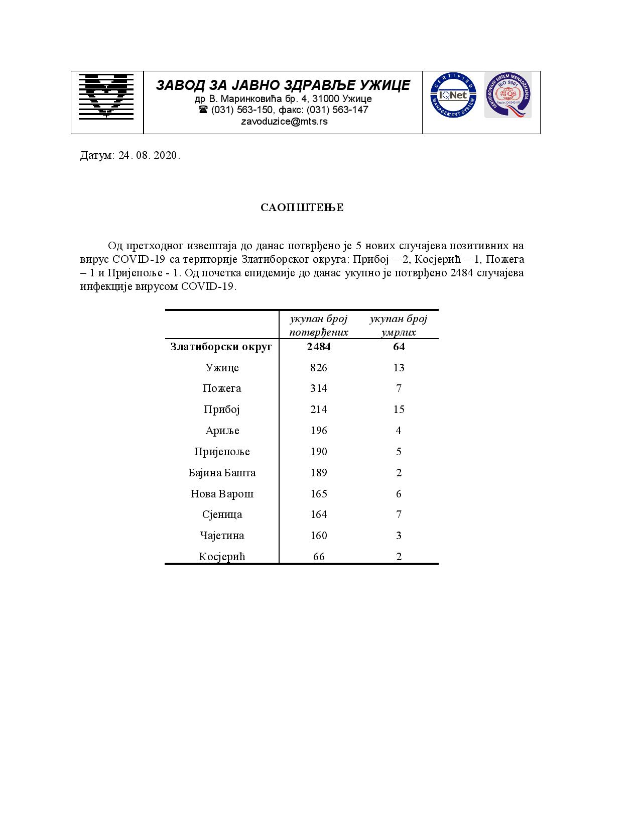 вирус COVID-19 са територије Златиборског округа: Прибој – 2, Косјерић – 1, Пожега
