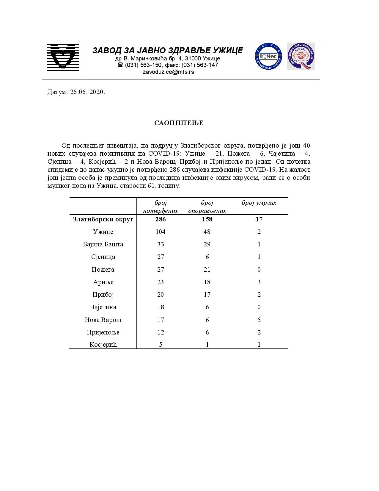 Од последњег извештаја, на подручју Златиборског округа, потврђено је још 40
