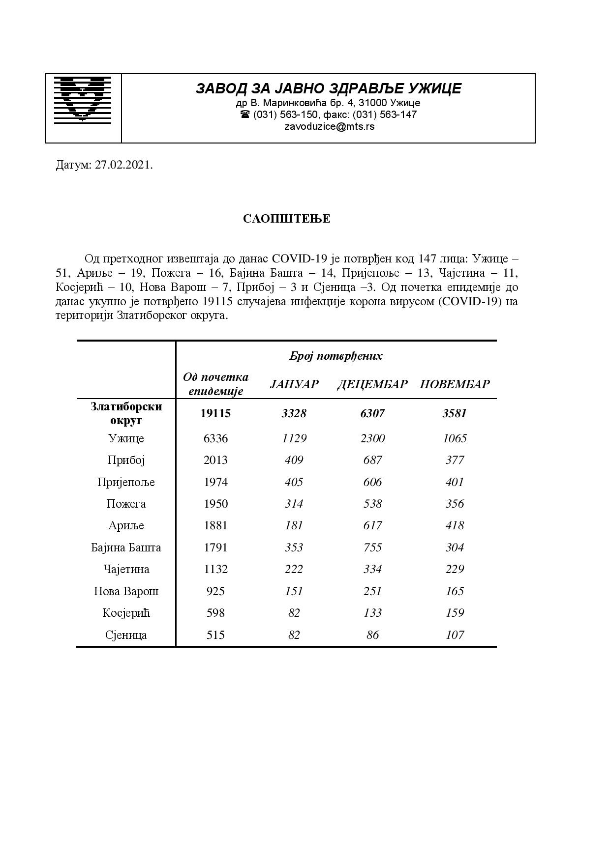 Од претходног извештаја до данас COVID-19 је потврђен код 147 лицa: Ужице –