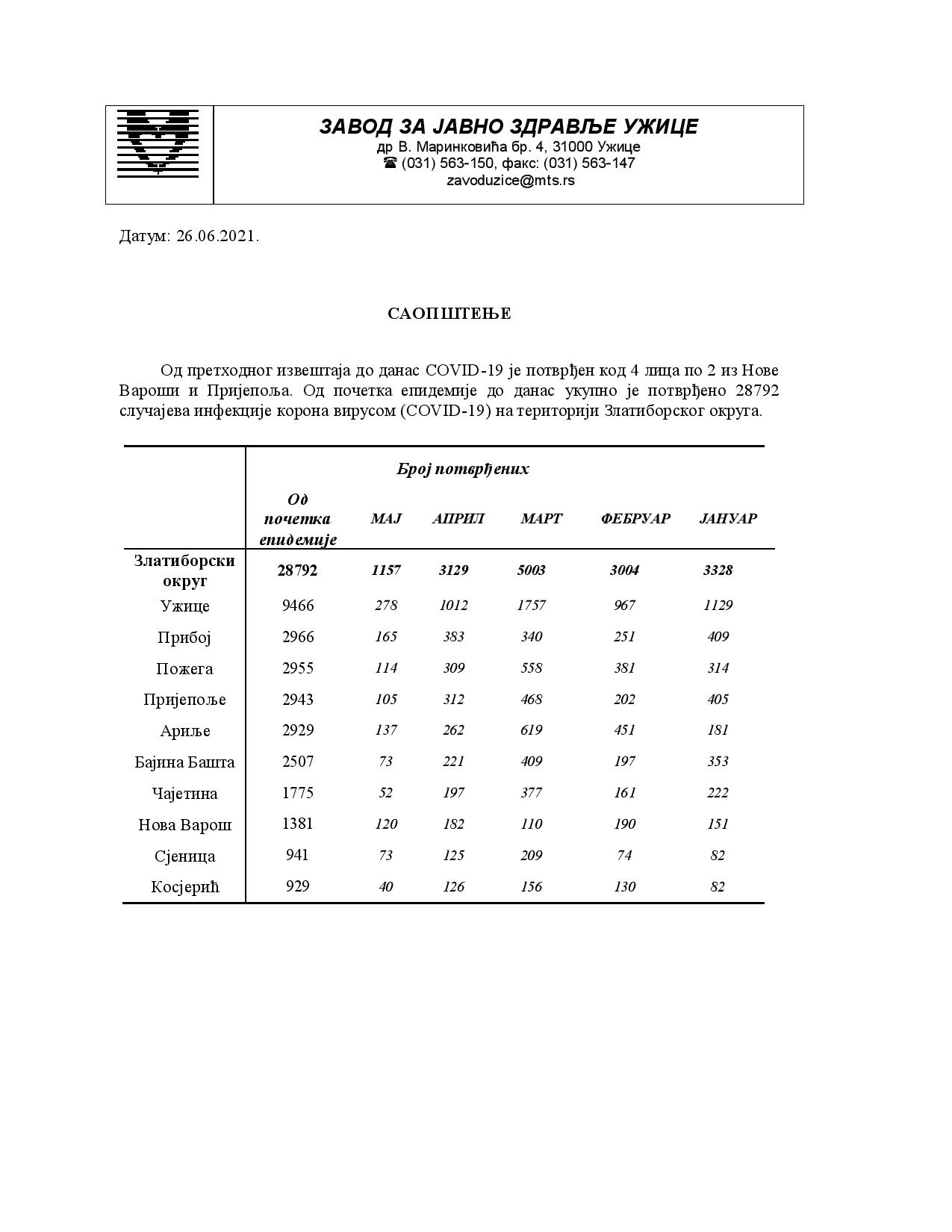Вароши и Пријепоља. Од почетка епидемије до данас укупно је потврђено 28792