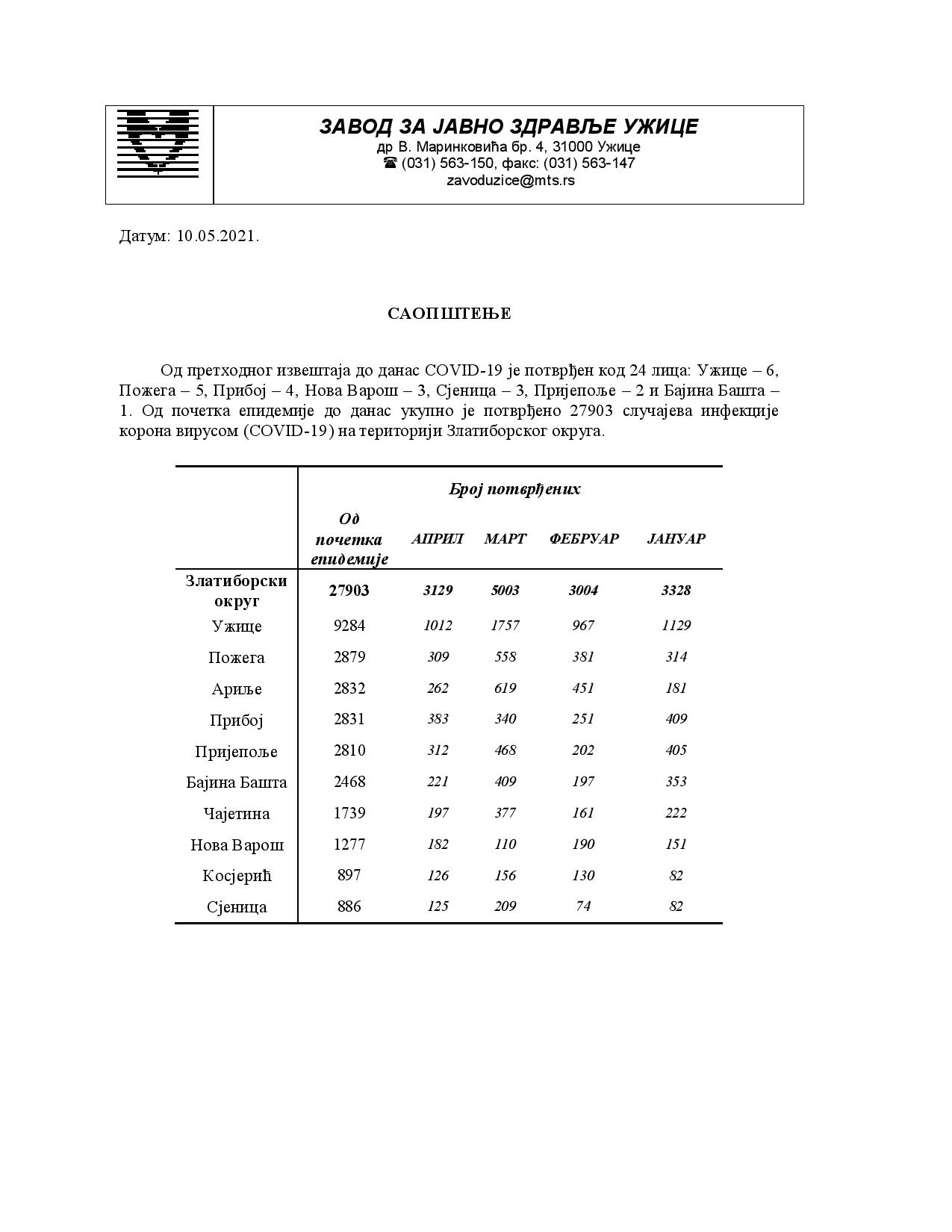 Од претходног извештаја до данас COVID-19 је потврђен код 24 лицa: Ужице – 6,
