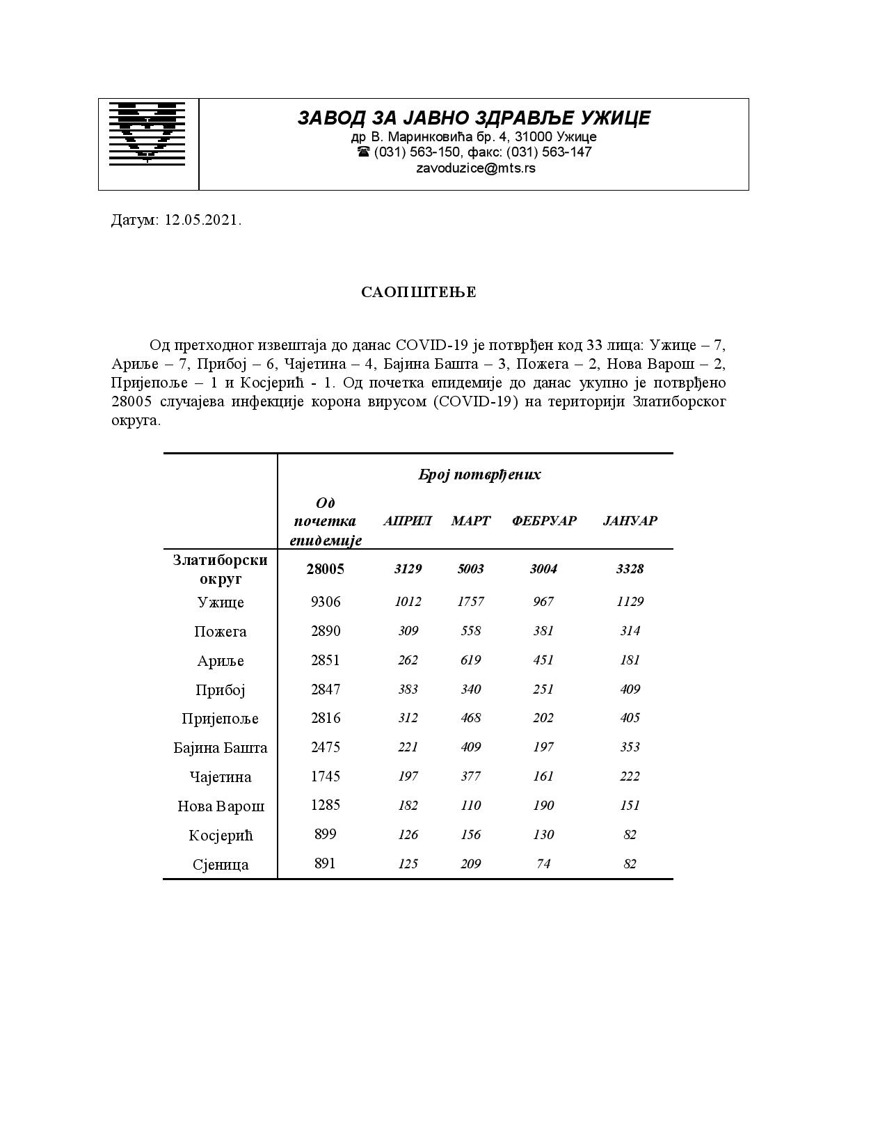 Од претходног извештаја до данас COVID-19 је потврђен код 33 лицa: Ужице – 7,