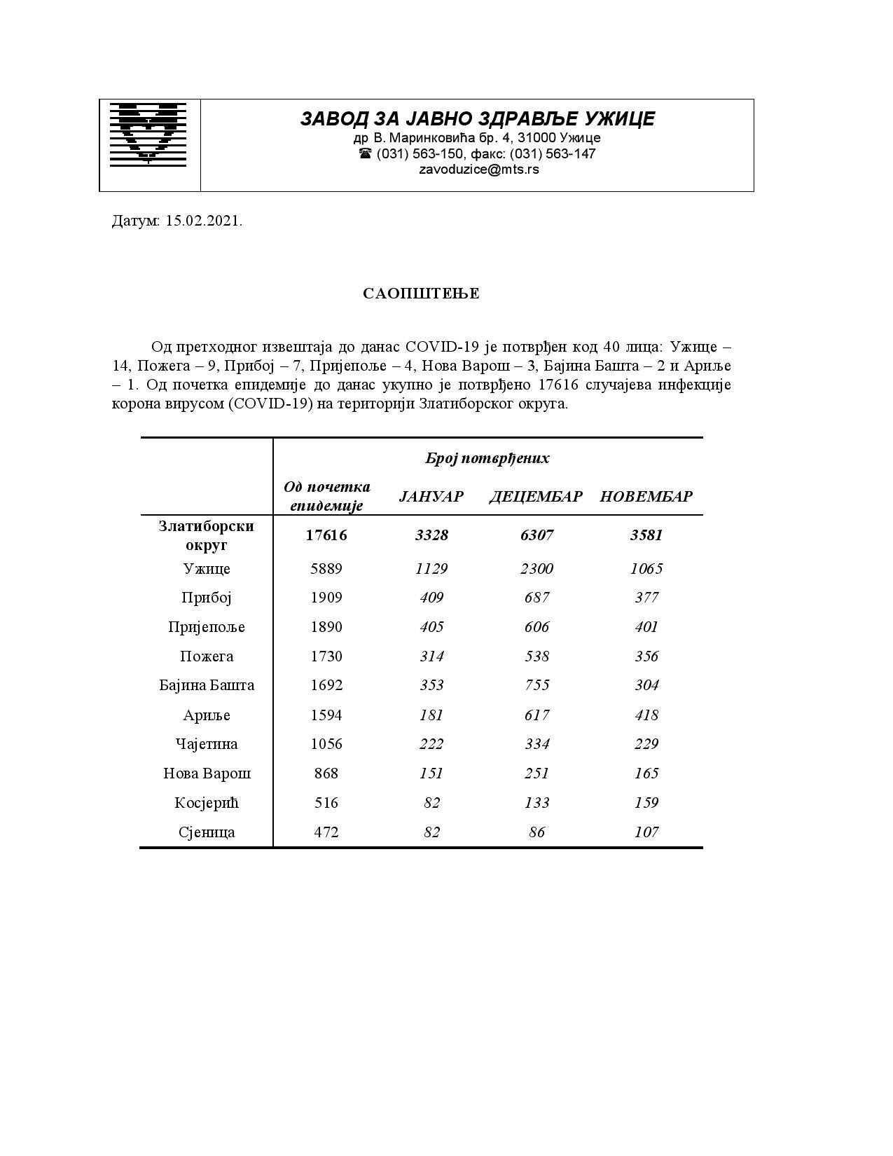 Од претходног извештаја до данас COVID-19 је потврђен код 40 лицa: Ужице –