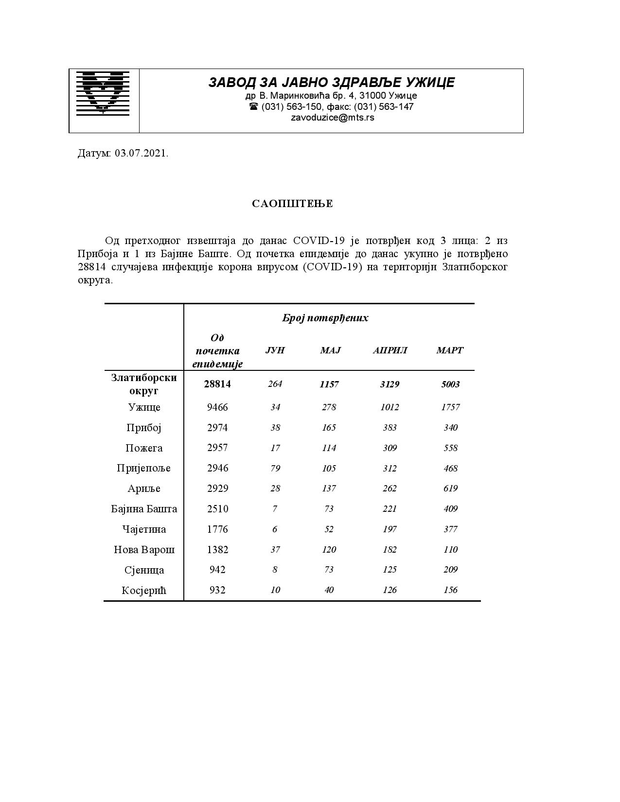Од претходног извештаја до данас COVID-19 је потврђен код 3 лица: 2 из