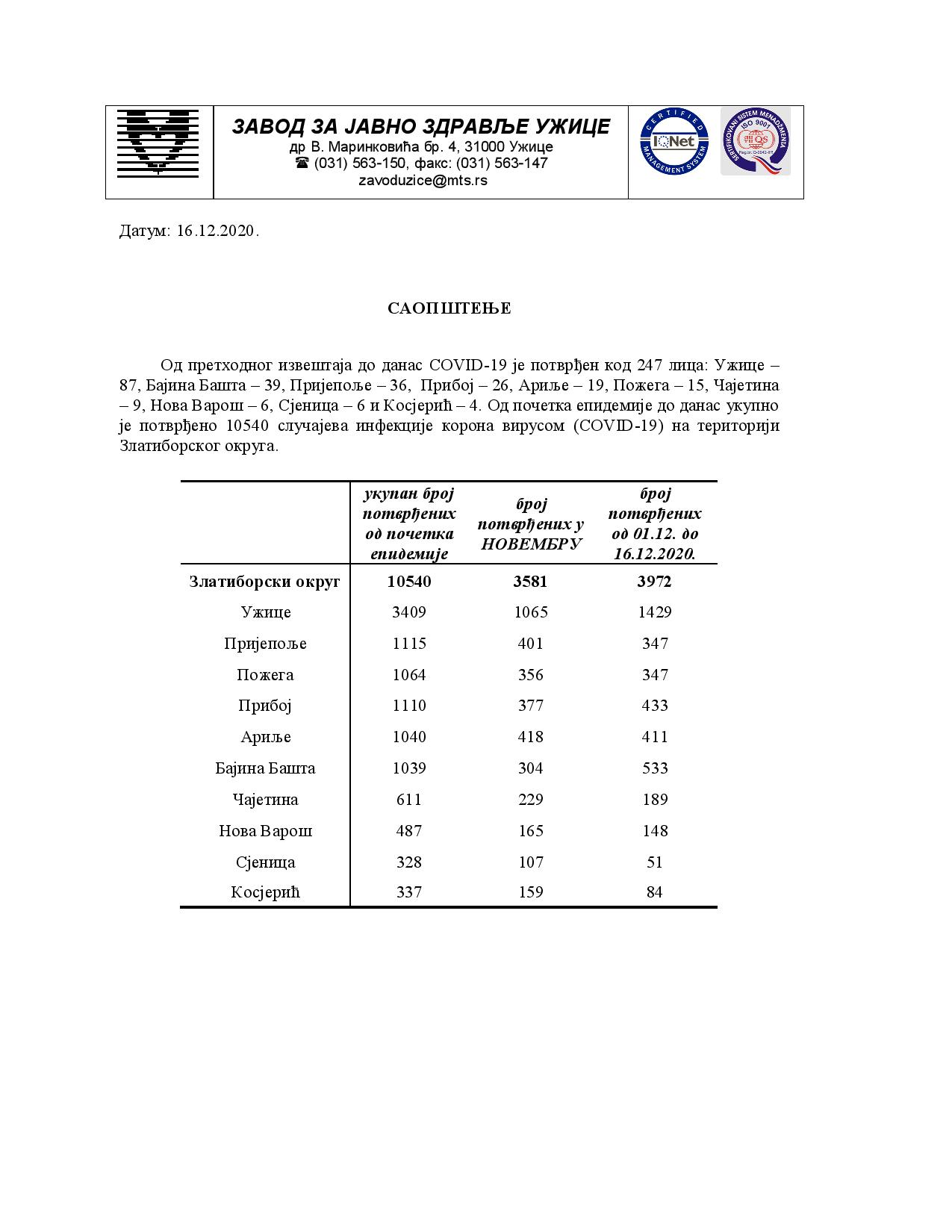 Од претходног извештаја до данас COVID-19 је потврђен код 247 лицa: Ужице –
