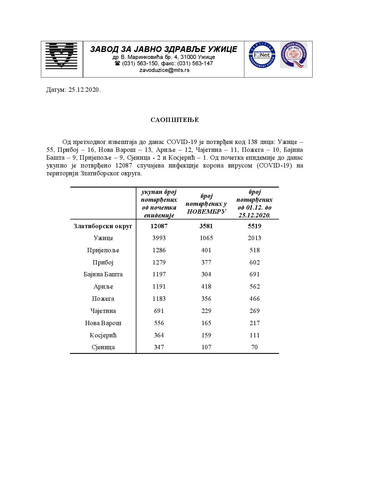 Од претходног извештаја до данас COVID-19 је потврђен код 138 лицa: Ужице –