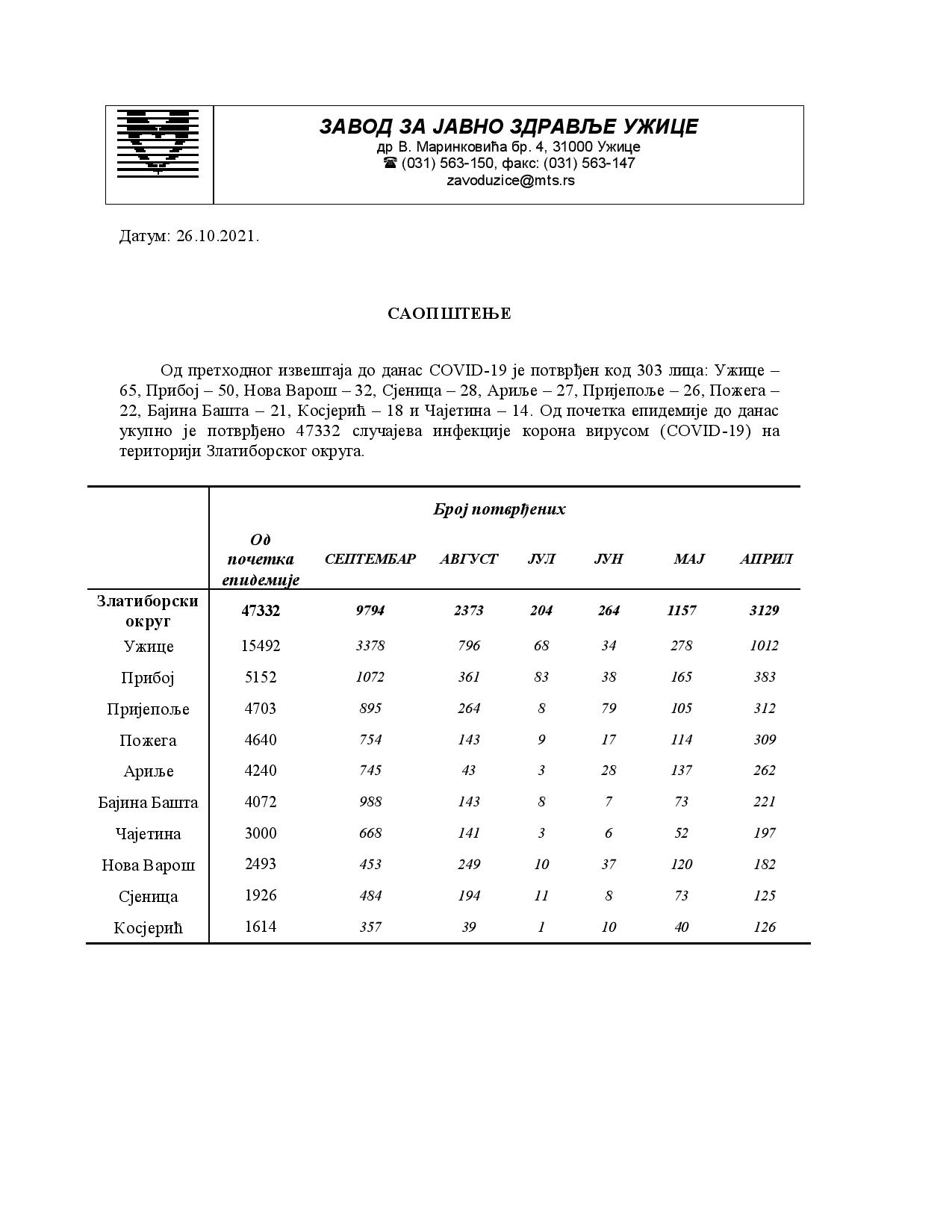 Од претходног извештаја до данас COVID-19 је потврђен код 303 лица: Ужице –