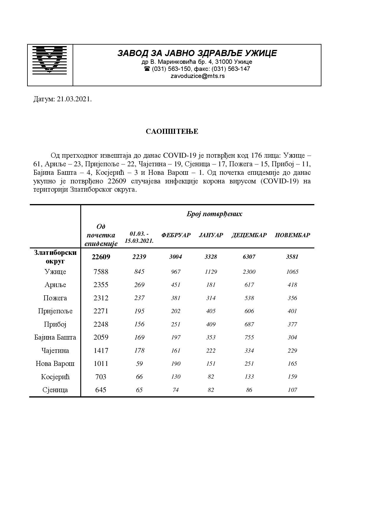 Од претходног извештаја до данас COVID-19 је потврђен код 176 лицa: Ужице –