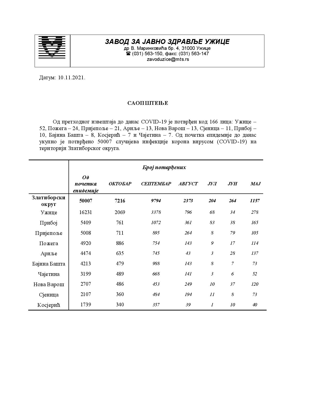 Од претходног извештаја до данас COVID-19 је потврђен код 166 лица: Ужице –