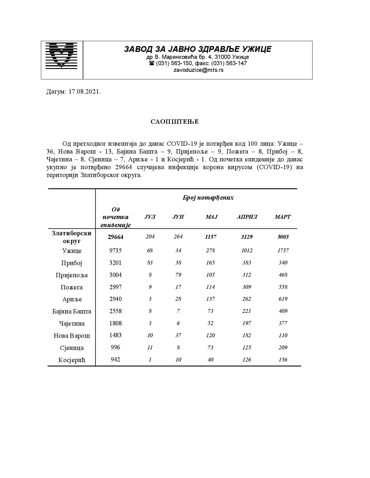Од претходног извештаја до данас COVID-19 је потврђен код 100 лица: Ужице –