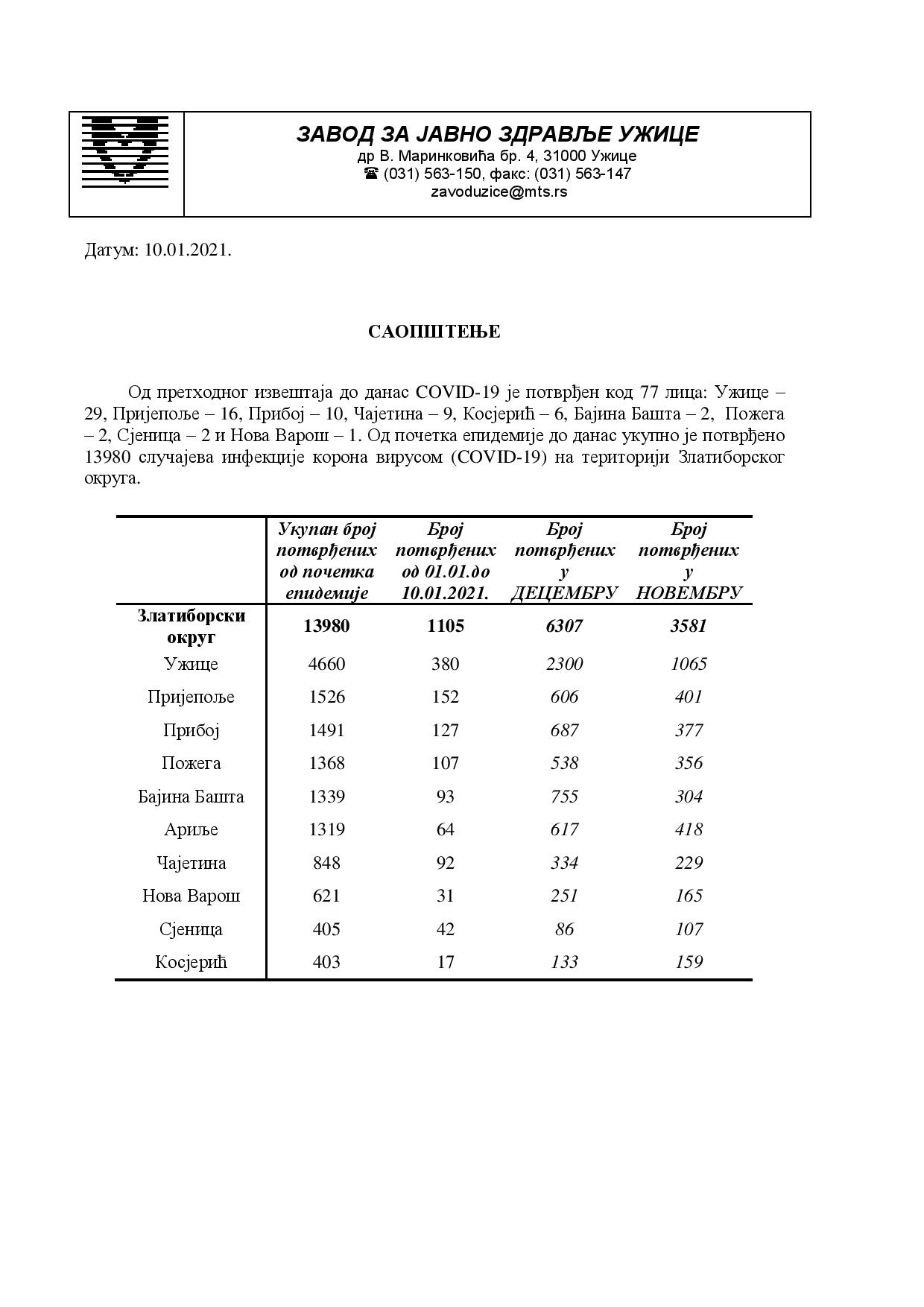 – 2, Сјеница – 2 и Нова Варош – 1. Од почетка епидемије до данас укупно је потврђено
