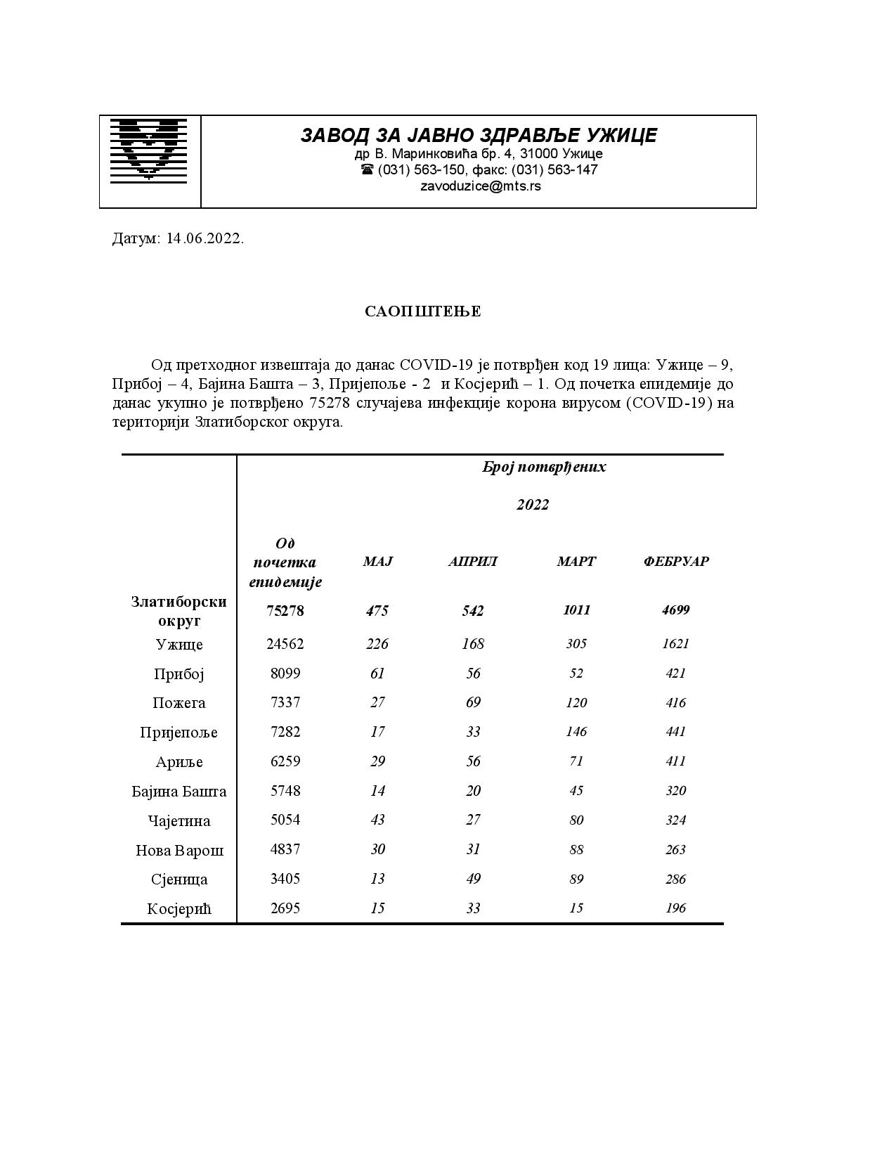 Од претходног извештаја до данас COVID-19 је потврђен код 19 лица: Ужице – 9,