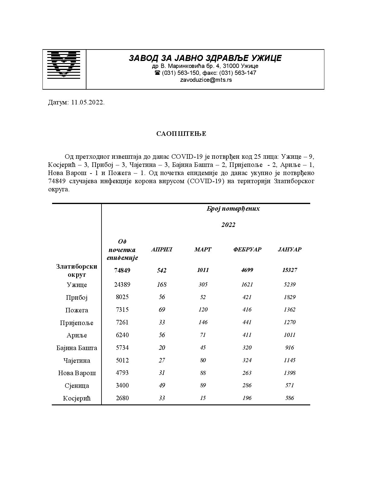 Од претходног извештаја до данас COVID-19 је потврђен код 25 лица: Ужице – 9,