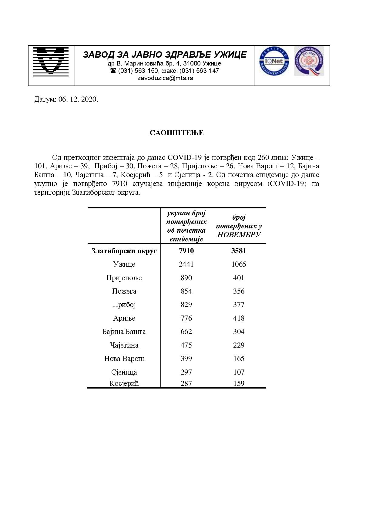 Од претходног извештаја до данас COVID-19 је потврђен код 260 лицa: Ужице –