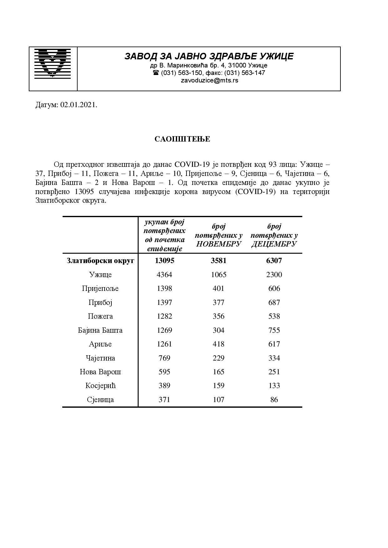 Од претходног извештаја до данас COVID-19 је потврђен код 93 лицa: Ужице –