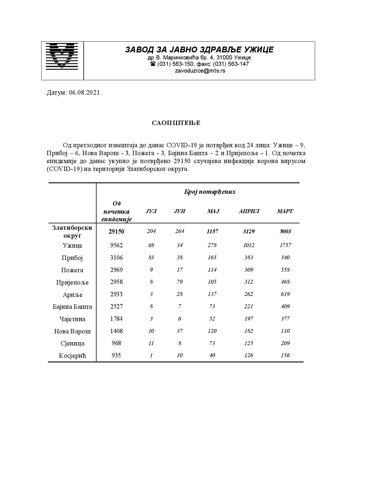Од претходног извештаја до данас COVID-19 је потврђен код 24 лица: Ужице – 9,