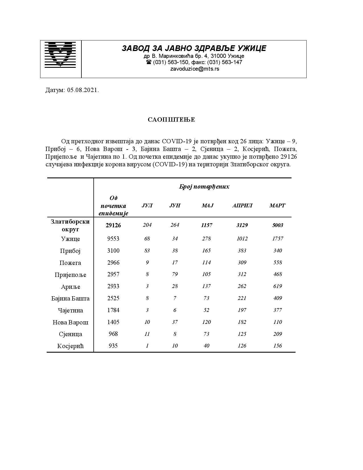 Од претходног извештаја до данас COVID-19 је потврђен код 26 лица: Ужице – 9,
