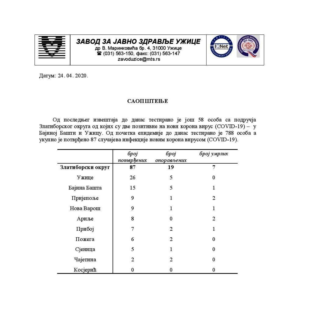 Данас су стигли налази теста на коронавирус за три особе из Бајине Баште, два налаза су негативна а један позитиван. Инфицирана је женска особа стара 71 годину и она упућена на лечене у КБЦ Земун – сазнаје Портал ББ глас. Ово је 15. случај инфицирања коронавирусум Ковид – 19 у општини Бајина Башта и по броју заражених наша општина је на другом месту на територији Златиборског округа. До сада пет пацијената се опоравило а један је преминуо.
