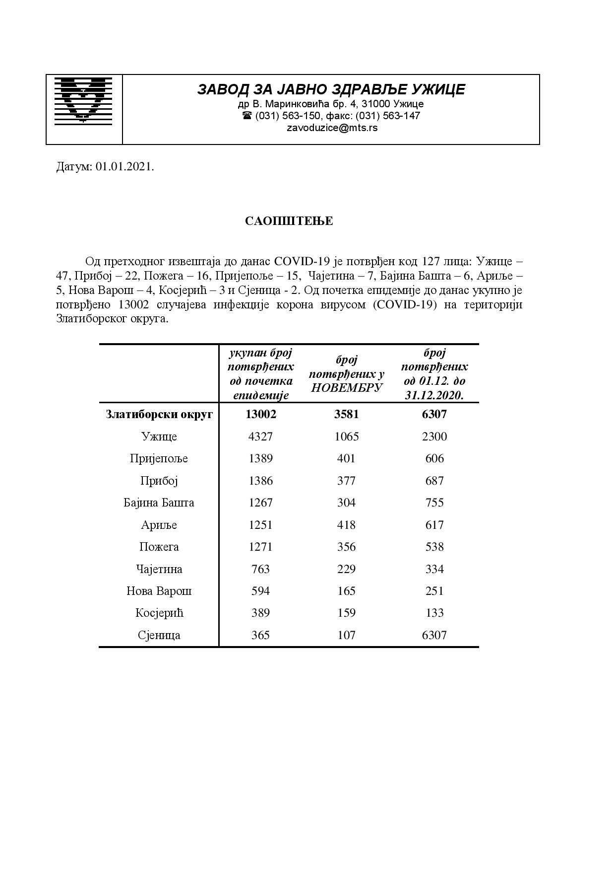 5, Нова Варош – 4, Косјерић – 3 и Сјеница – 2. Од почетка епидемије до данас укупно је