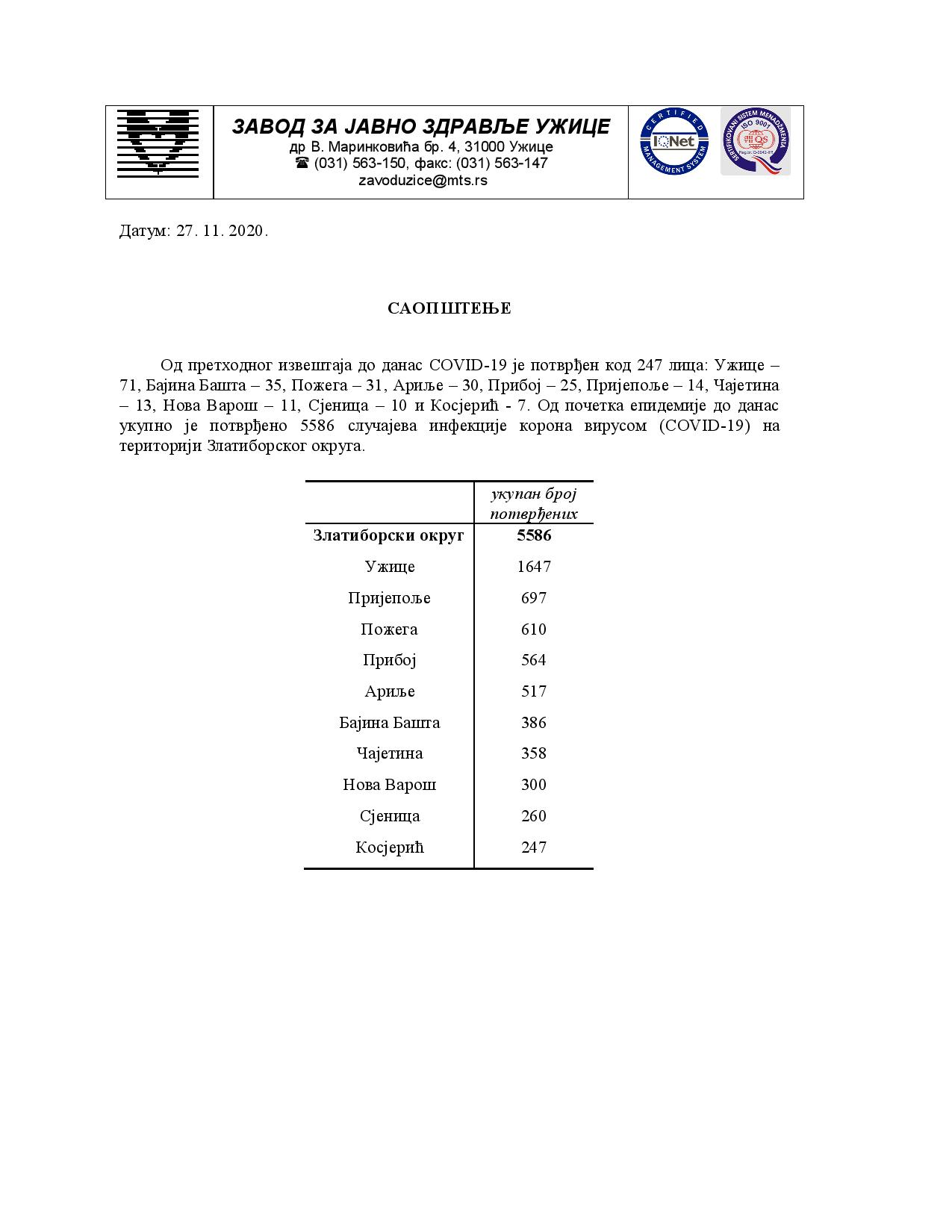 Од претходног извештаја до данас COVID-19 је потврђен код 247 лицa: Ужице –
