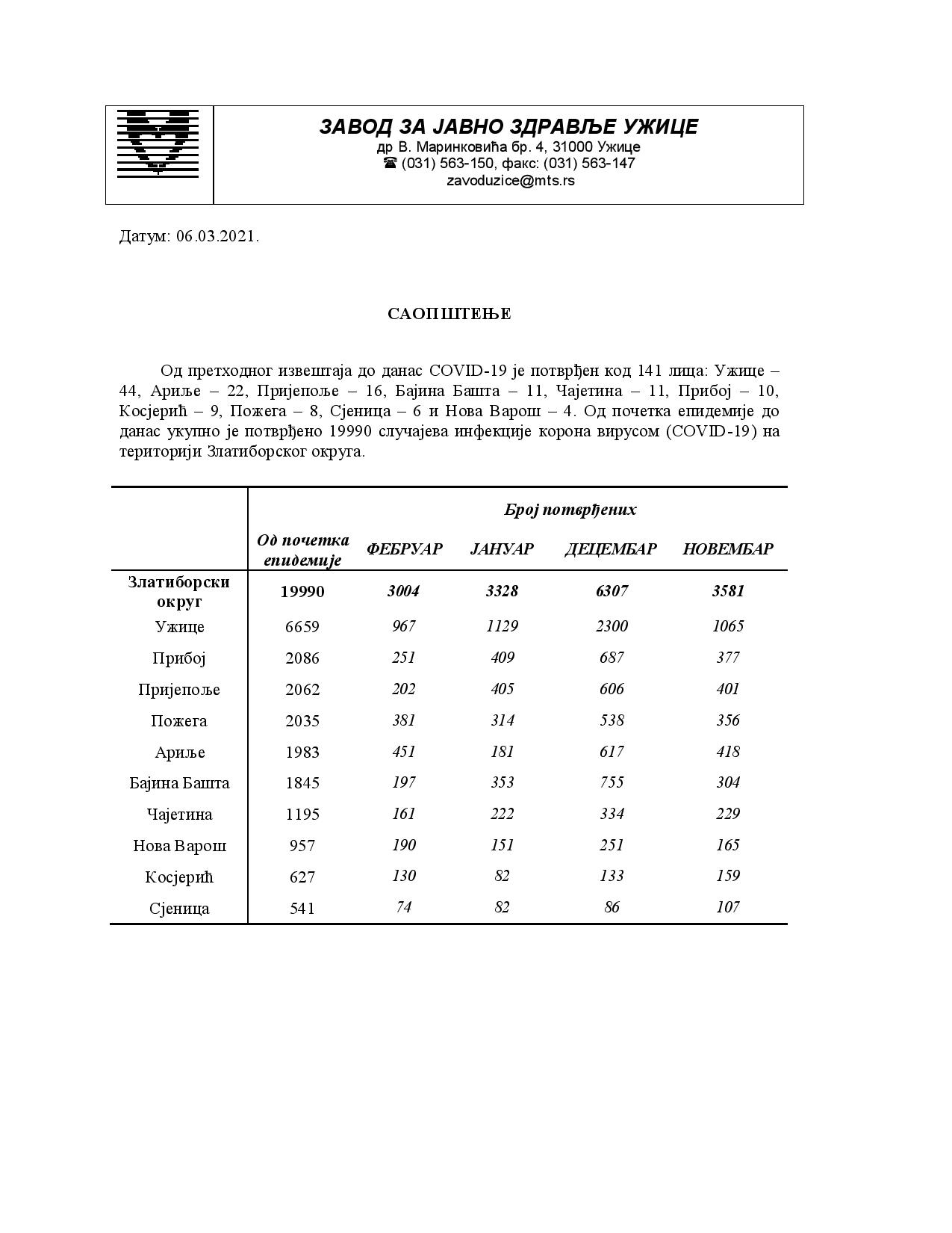 Од претходног извештаја до данас COVID-19 је потврђен код 141 лицa: Ужице –
