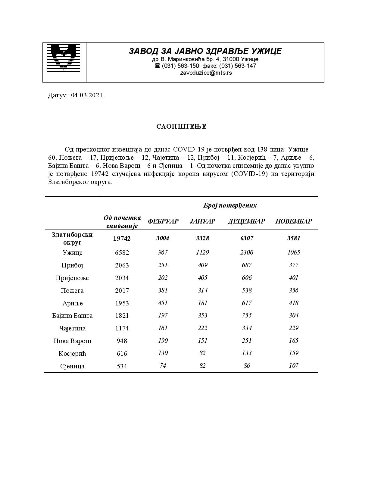Од претходног извештаја до данас COVID-19 је потврђен код 138 лицa: Ужице –