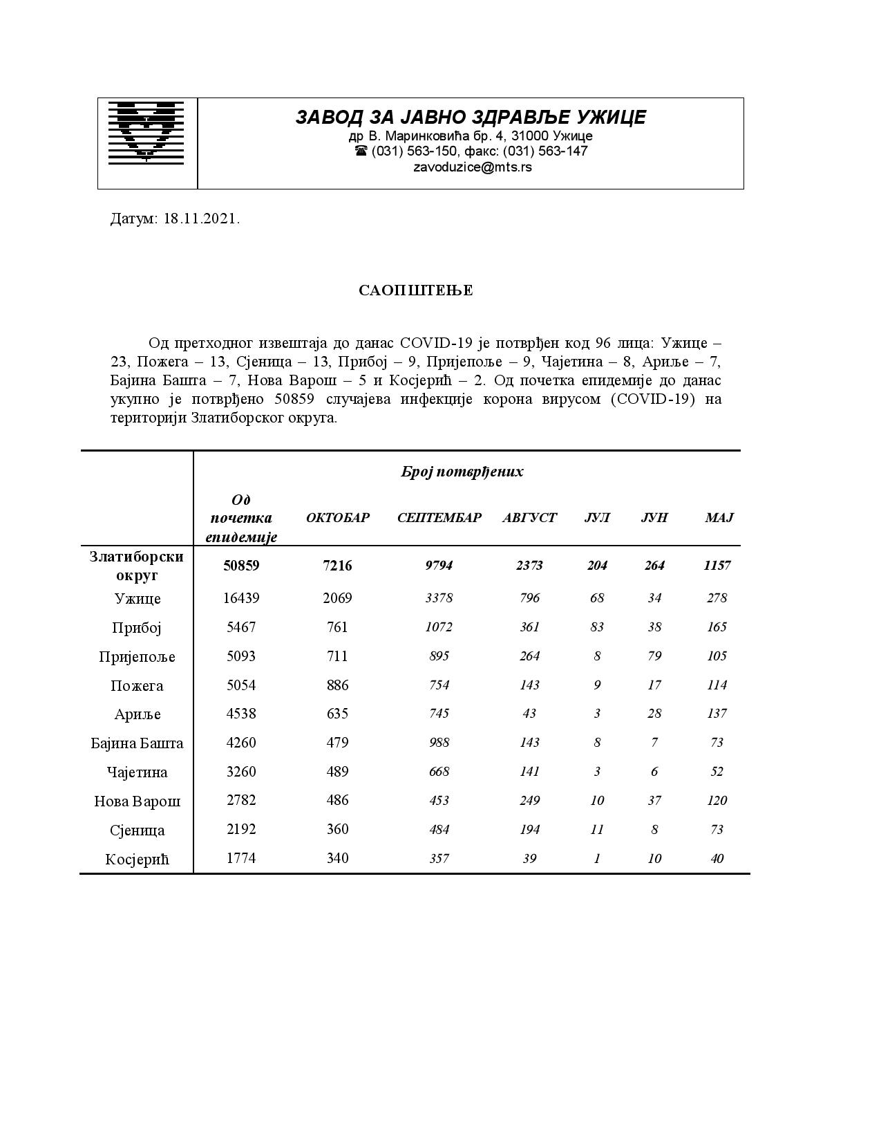 Од претходног извештаја до данас COVID-19 је потврђен код 96 лица: Ужице –