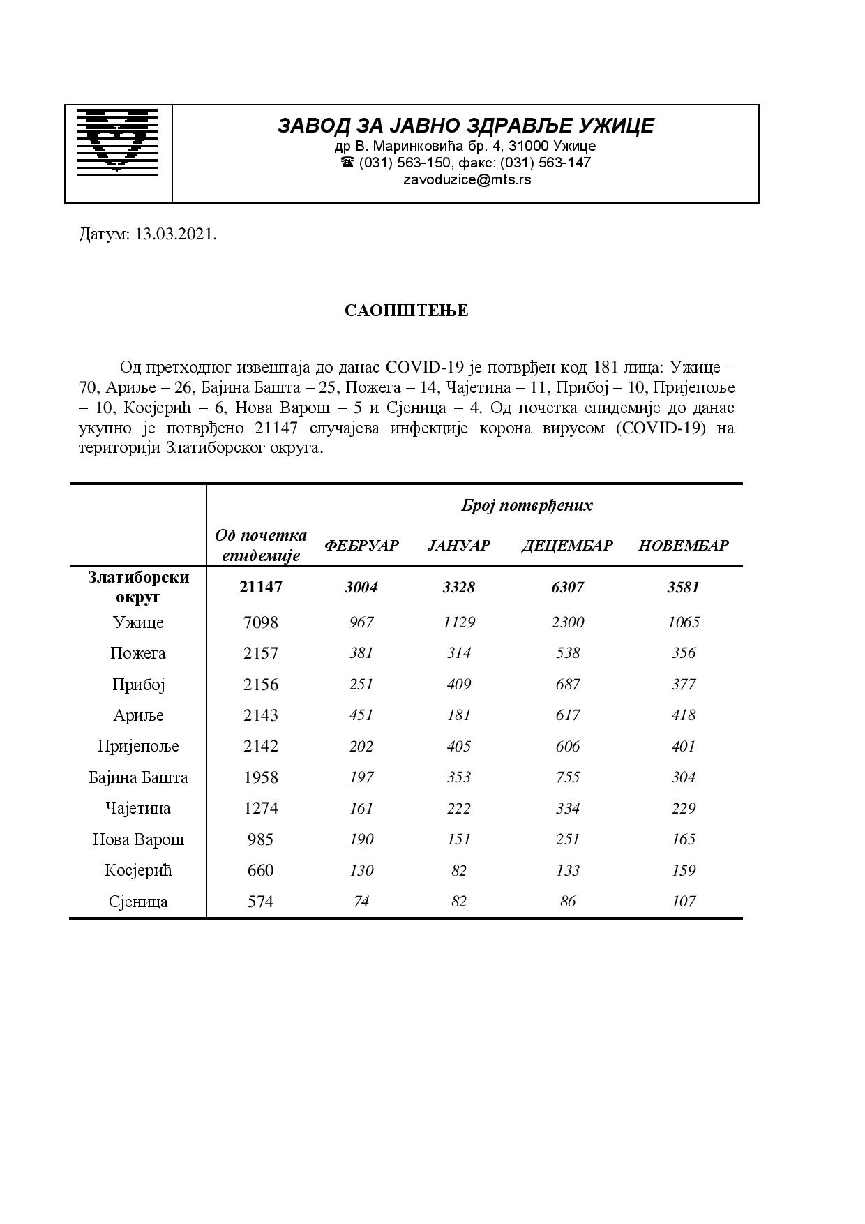 Од претходног извештаја до данас COVID-19 је потврђен код 181 лицa: Ужице –
