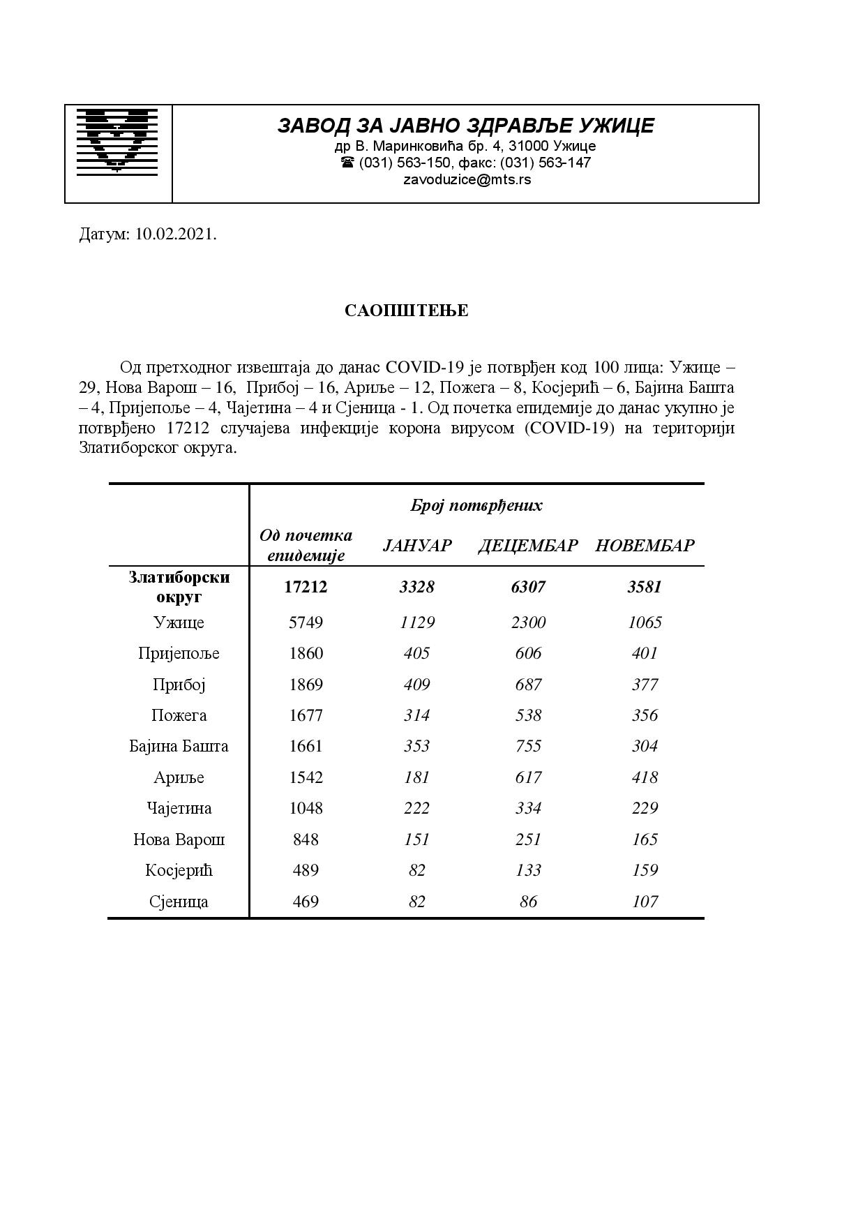 Од претходног извештаја до данас COVID-19 је потврђен код 100 лицa: Ужице –