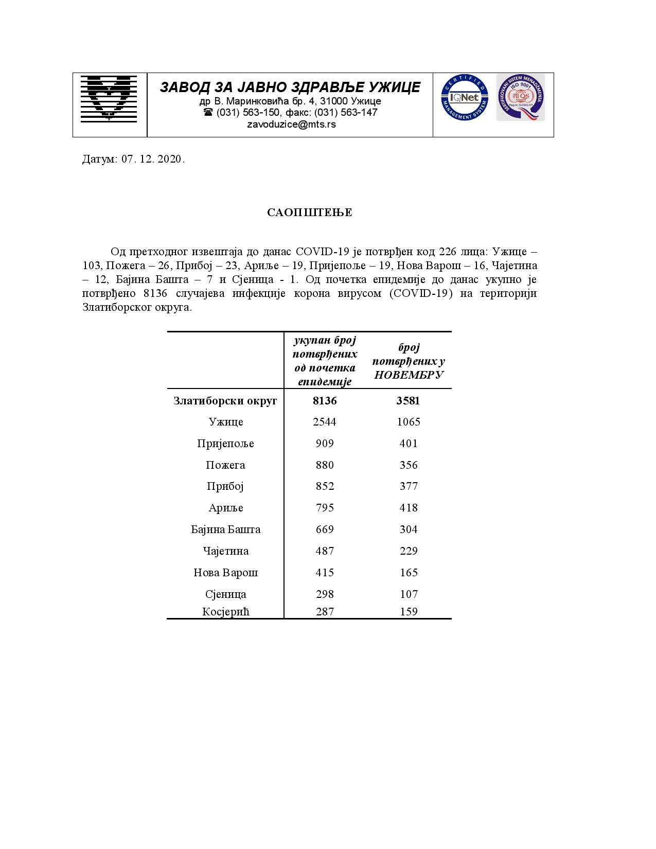 Од претходног извештаја до данас COVID-19 је потврђен код 226 лицa: Ужице –