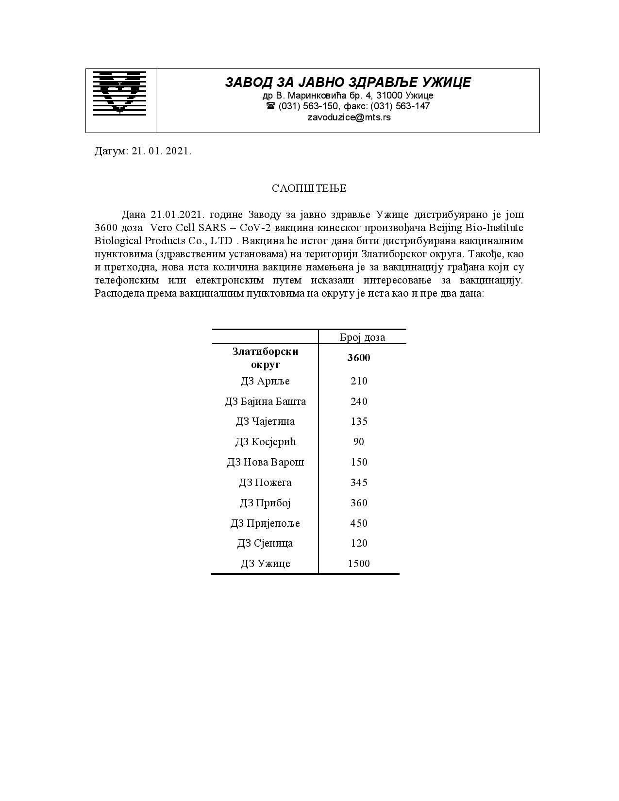 Дана 21.01.2021. године Заводу за јавно здравље Ужице дистрибуирано је још