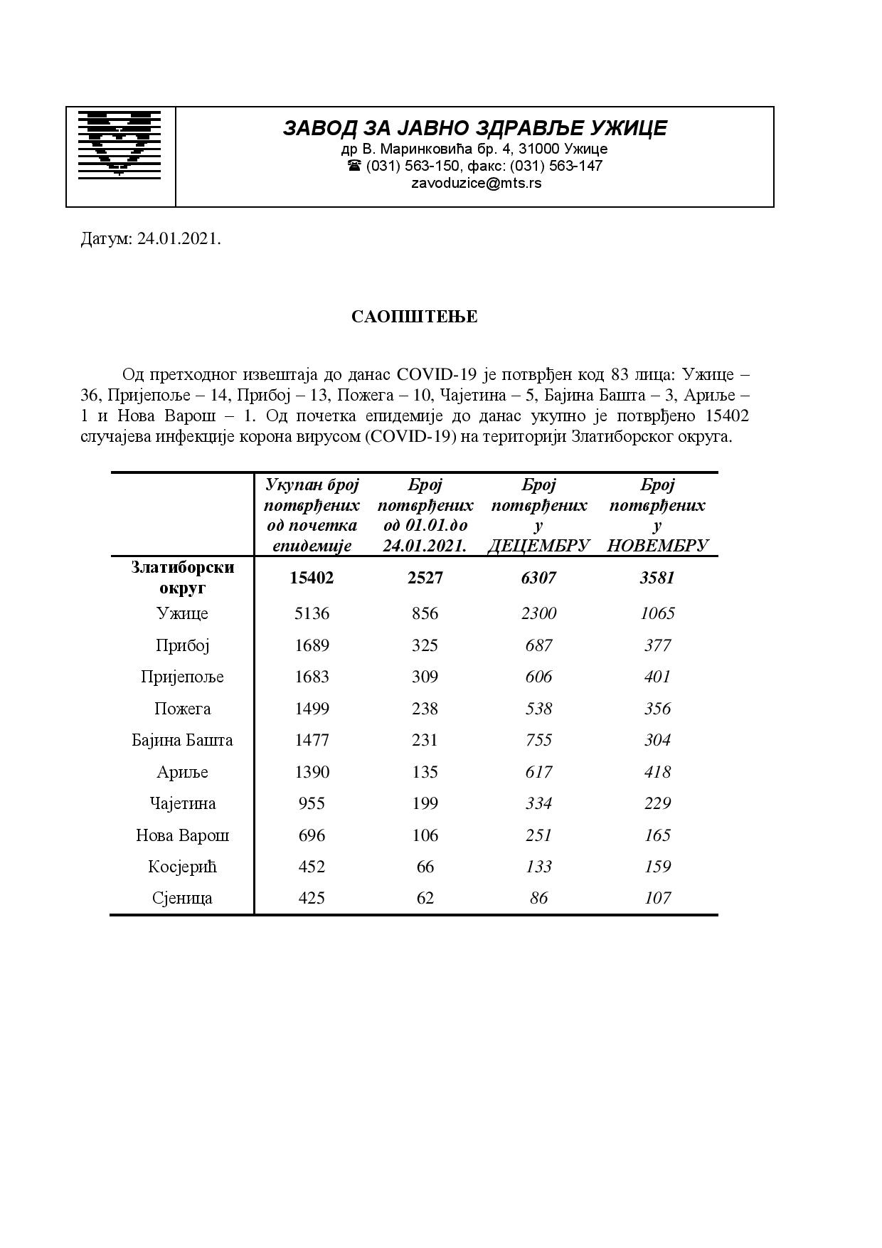 1 и Нова Варош – 1. Од почетка епидемије до данас укупно је потврђено 15402