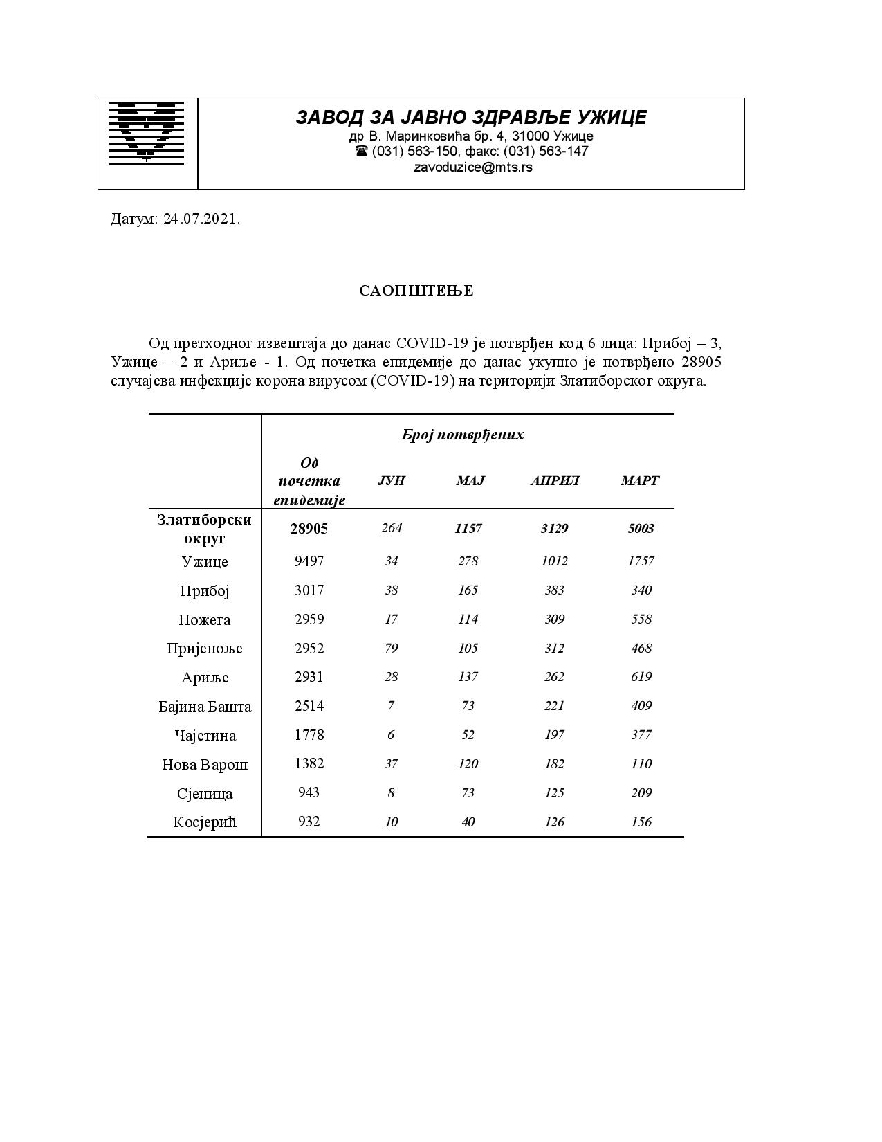 Ужице – 2 и Ариље – 1. Од почетка епидемије до данас укупно је потврђено 28905