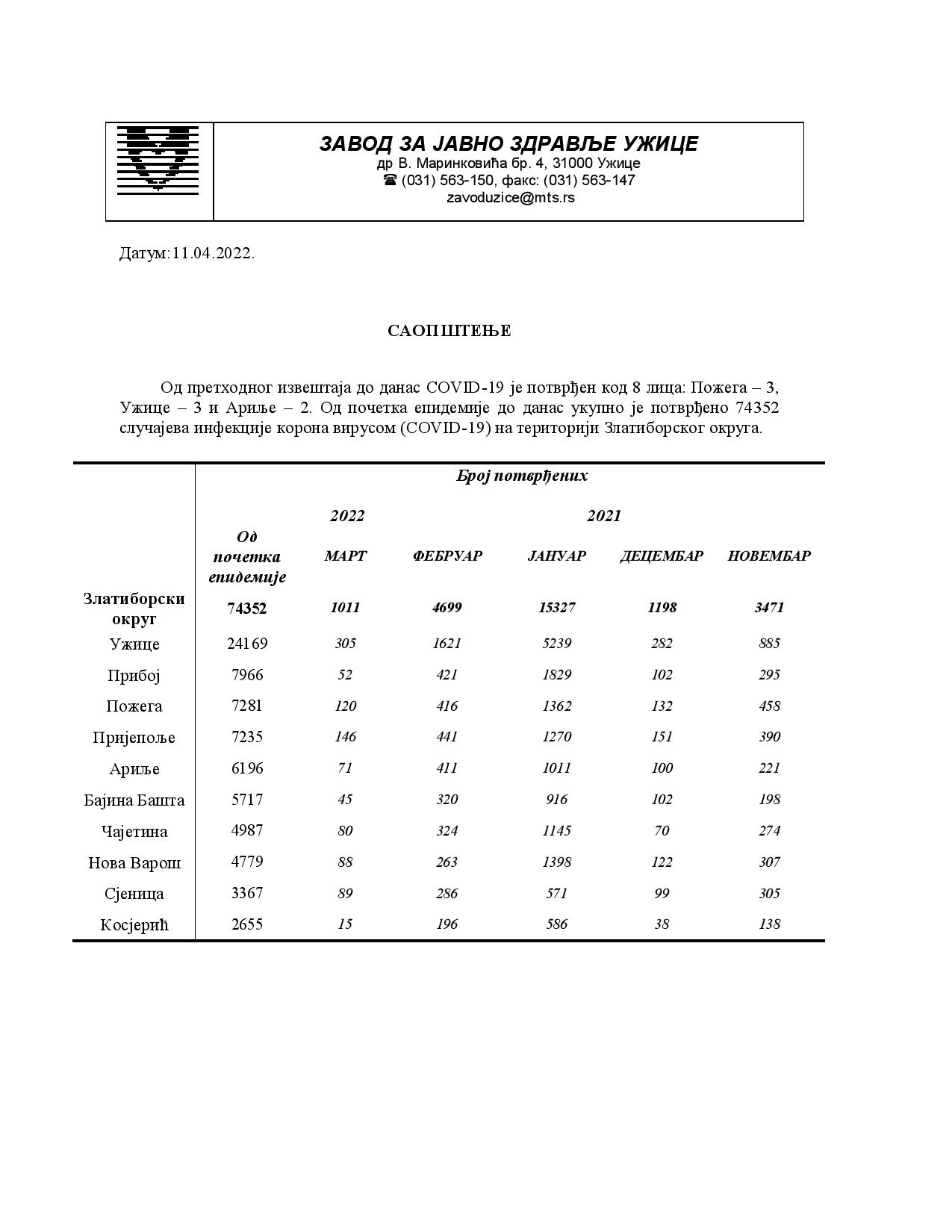 Ужице – 3 и Ариље – 2. Од почетка епидемије до данас укупно је потврђено 74352