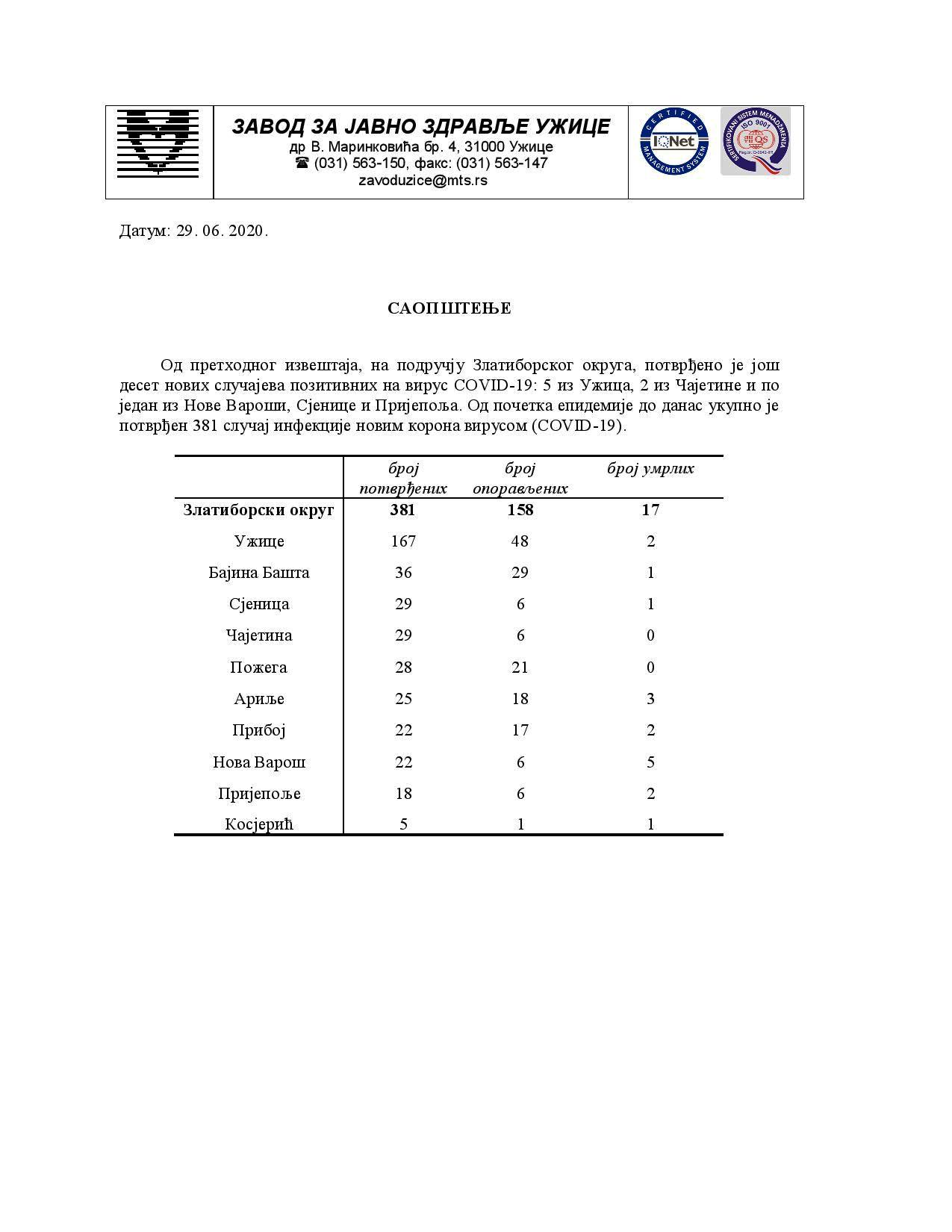 десет нових случајева позитивних на вирус COVID-19: 5 из Ужица, 2 из Чајетине и по