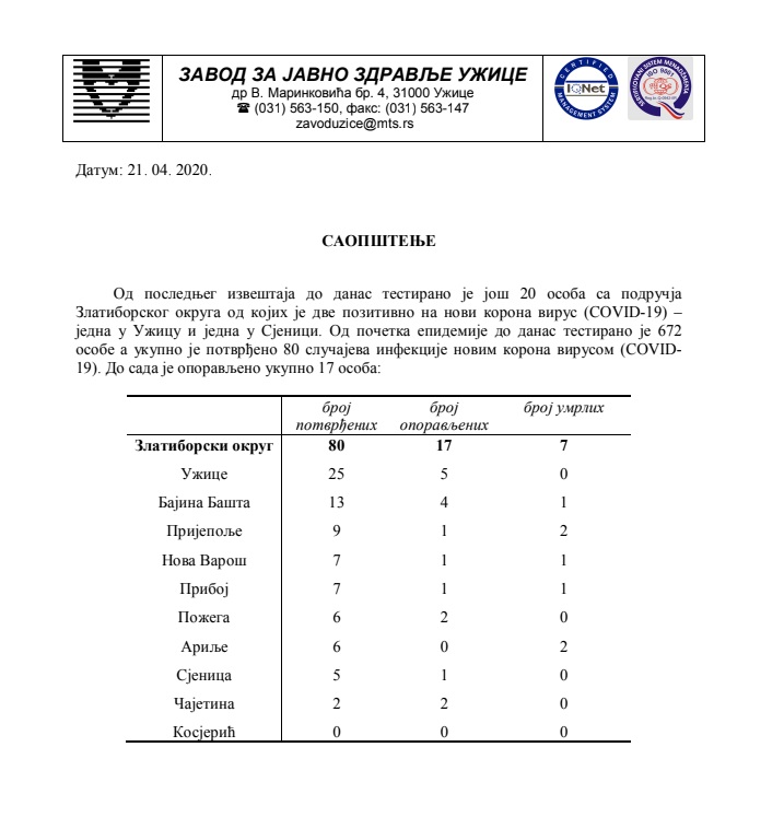 једна у Ужицу и једна у Сјеници. Од почетка епидемије до данас тестирано је 672
