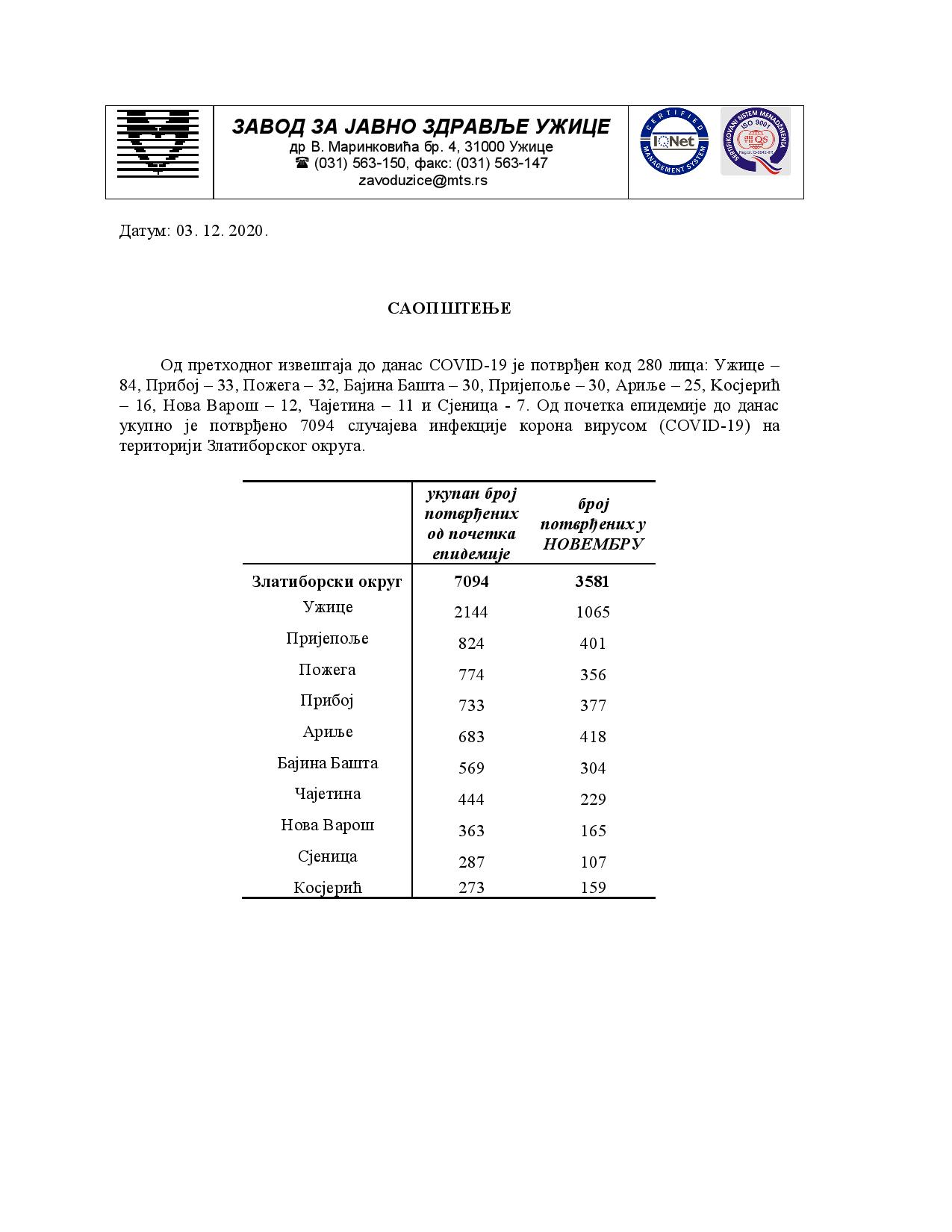 Од претходног извештаја до данас COVID-19 је потврђен код 280 лицa: Ужице –
