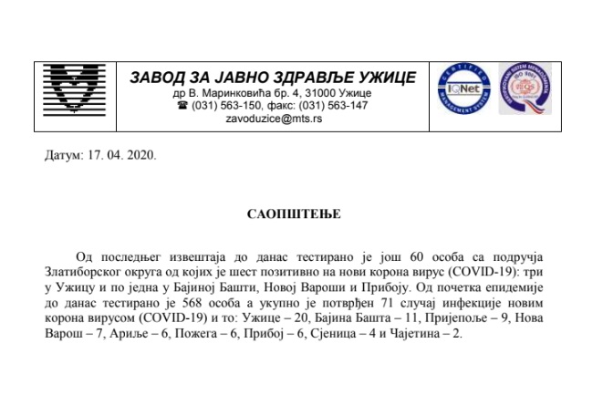 Златиборског округа од којих је шест позитивно на нови корона вирус (COVID-19): три у Ужицу и по једна у Бајиној Башти, Новој Вароши и Прибоју. Од почетка епидемије до данас тестирано је 568 особа а укупно је потврђен 71 случај инфекције новим корона вирусом (COVID-19) и то: