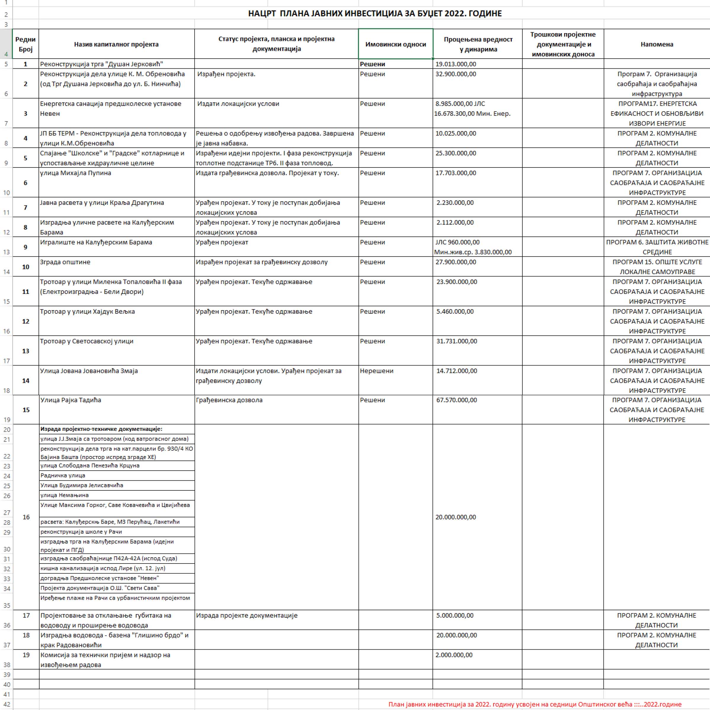 | Изградња уличне расвете на Калуђерским Барама | Урађен пројекат. У току је поступак добијања локацијских услова | Решени | 2.112.000,00 | |