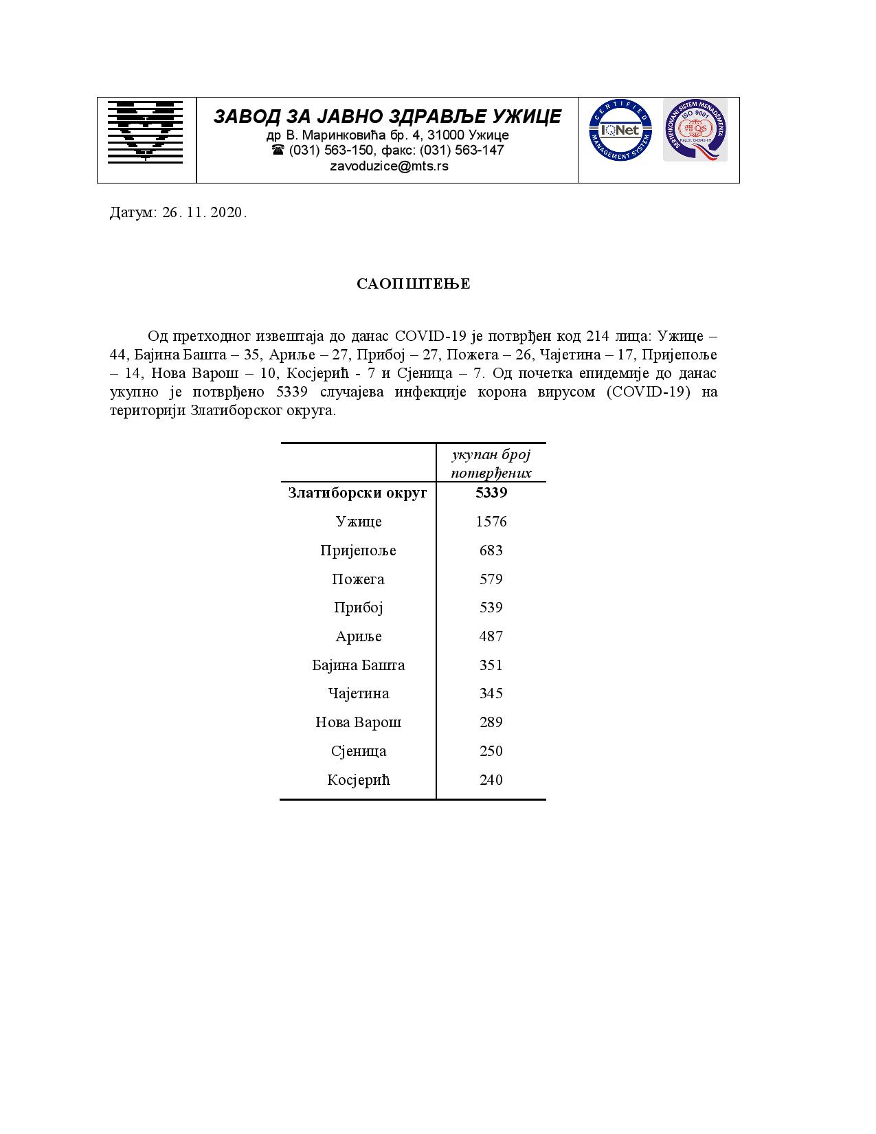 Од претходног извештаја до данас COVID-19 је потврђен код 214 лицa: Ужице –