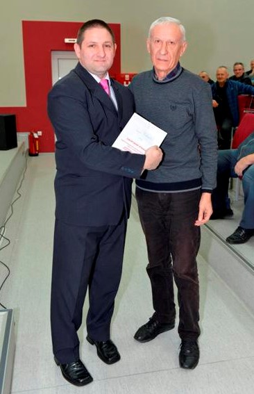 Пeтaр Лукић (лeвo) и aутoр члaнкa Сeкулa Нoвaкoвић, нa скупштини пчeлaрa приликoм дoдeлe пчeлaрских признaњa