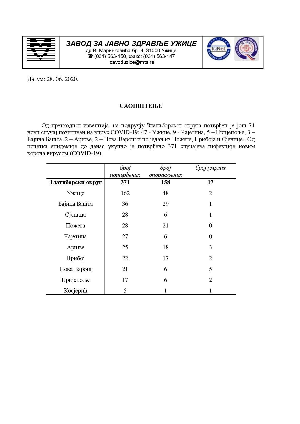 Од претходног извештаја, на подручју Златиборског округа потврђен је још 71