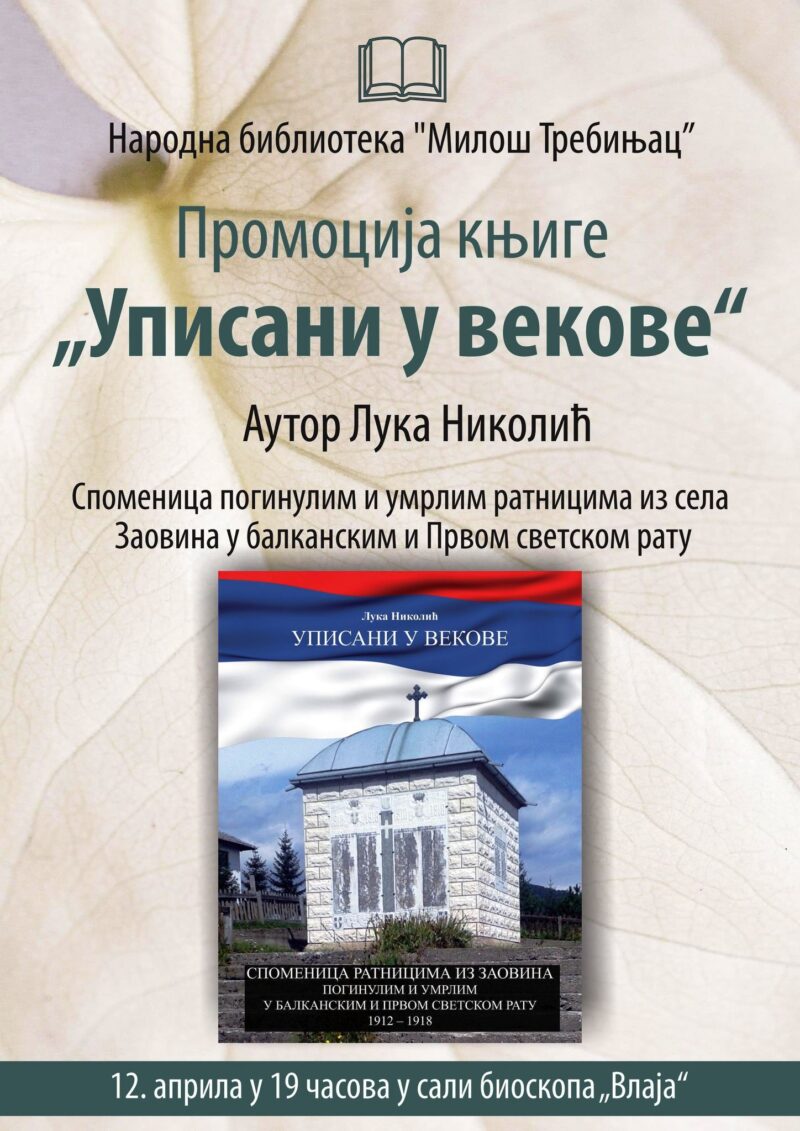 У издању Народне библиотеке „Милош Требињац“ објављена је књига аутора Луке Николића, пензионисаног потпуковника родом из Заовина. У овој књизи интерпретирани су прикупљени подаци о погинулима и умрлим ратницима из села Заовина у балканским и Првом светском рату. Из ове споменице јасно се чита да је у рат мобилисано сво мушко становништво из Заовина, сви војно способни мушкарци, све што је могло пушку да носи. Већина оних који су отишли у балканске ратове и „Велики рат“ нису се вратили. За већину славних ратника из Заовина који су своје кости оставили на бранику Отаџбине аутор је са много потешкоћа успео да прикупи основне податке. Нико до данас није покушао да установи податке о томе ко су очеви и мајке ратника, ко су њихови потомци, у којим јединицама су били на ратном распореду, где и када су погинули, где су остали да почивају. Управо ту истину, у недовршеном облику, садржи ова споменица. Осим 203 ратника чија су имена уклесана на спомен – плочи споменика у Вежањи, у Споменици су наведена још 4 ратника која су из непознатих разлога изостављена на спомен – плочи. Тако укупан број страдалих Заовљана у балканским и Првом светском рату износи 207 ратника ратника и жртава рата. Промоција књиге „Уписани у векове“ ће се одржати 12. априла у 19 часова у сали биоскопа „Влаја“ уз богат пригодни програм.