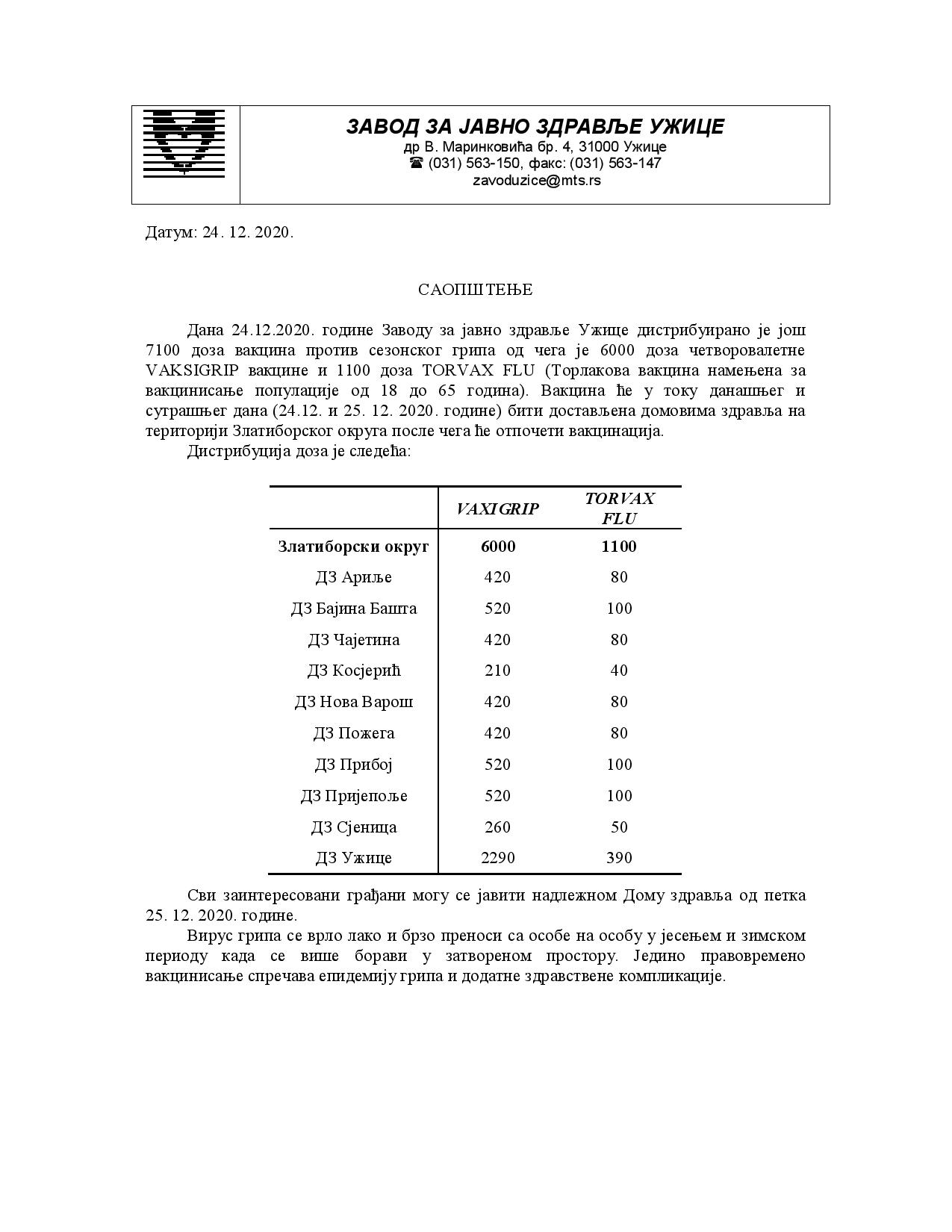 Дана 24.12.2020. године Заводу за јавно здравље Ужице дистрибуирано је још