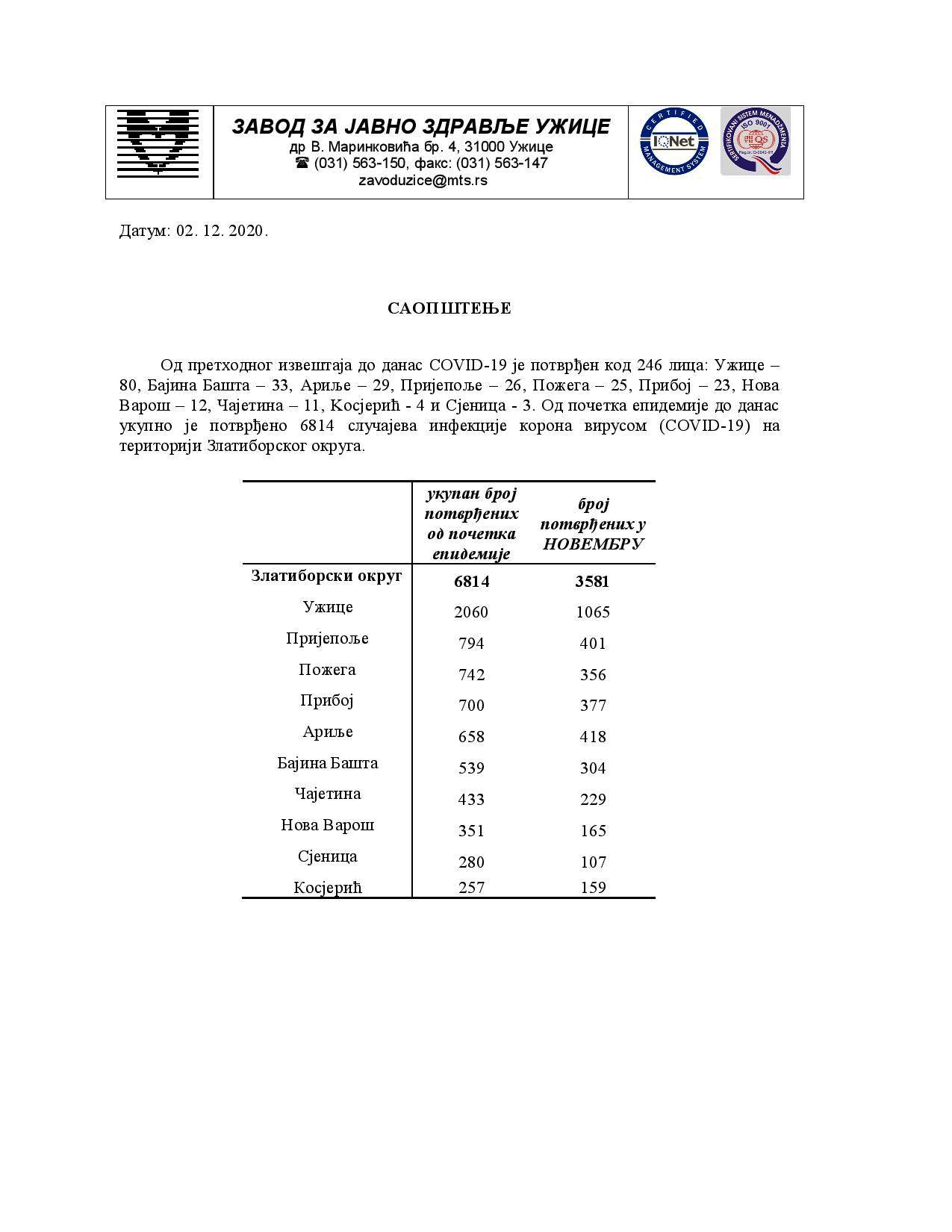 Од претходног извештаја до данас COVID-19 је потврђен код 246 лицa: Ужице –