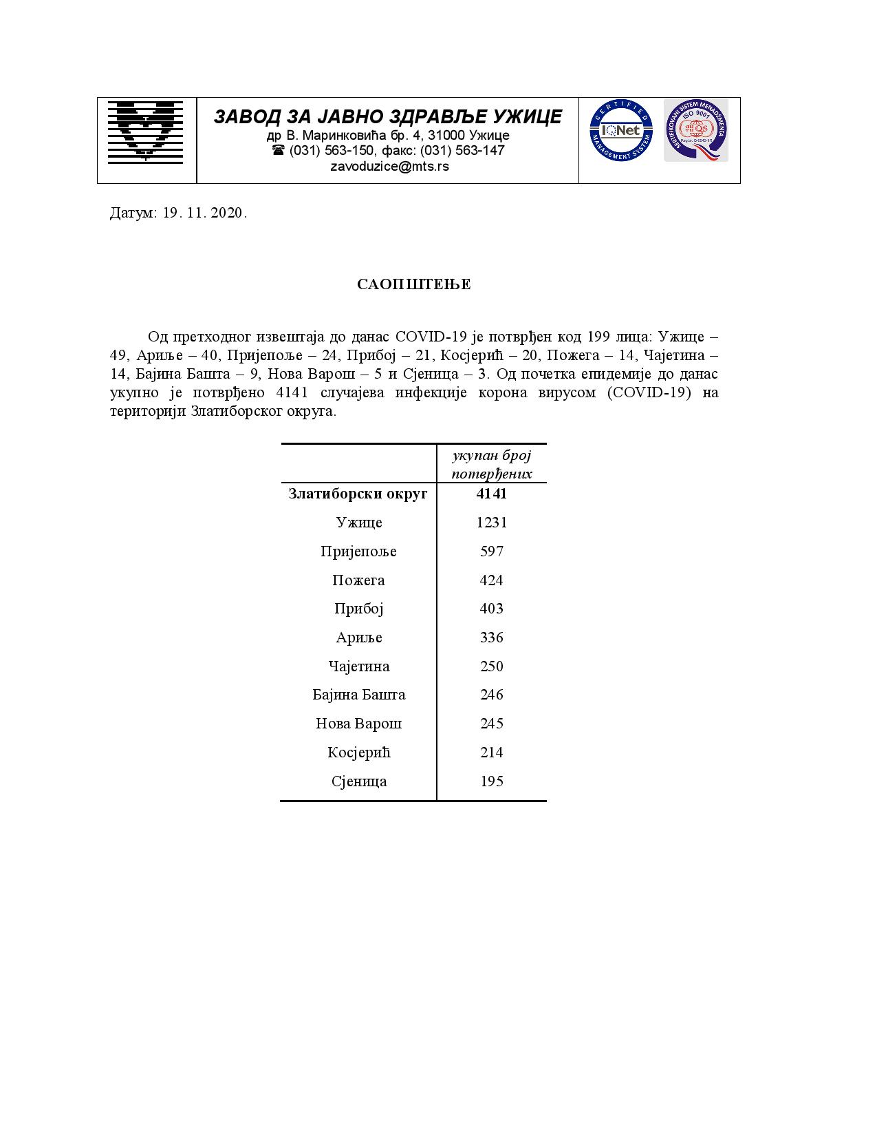 Од претходног извештаја до данас COVID-19 је потврђен код 199 лицa: Ужице –