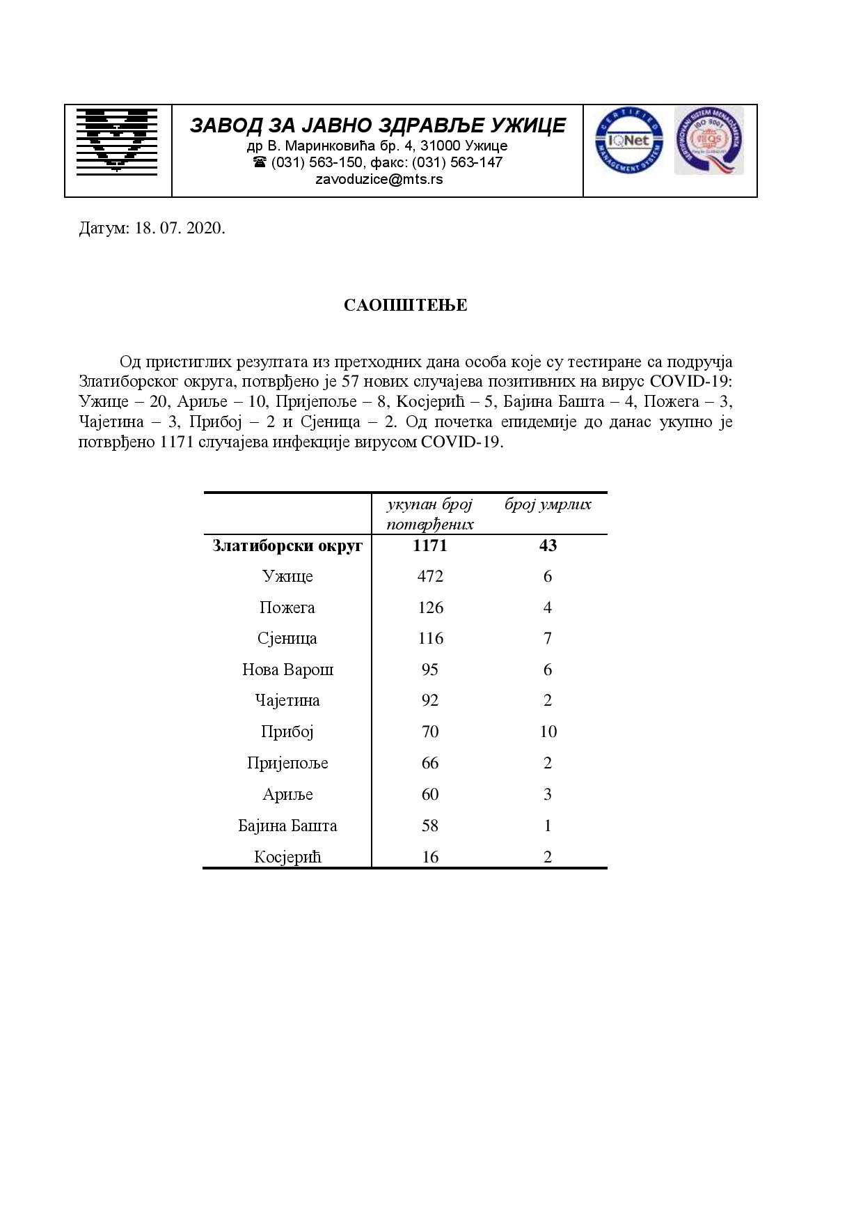 потврђено 1171 случајева инфекције вирусом COVID-19.Saopstenje za medije_18.07-page-001