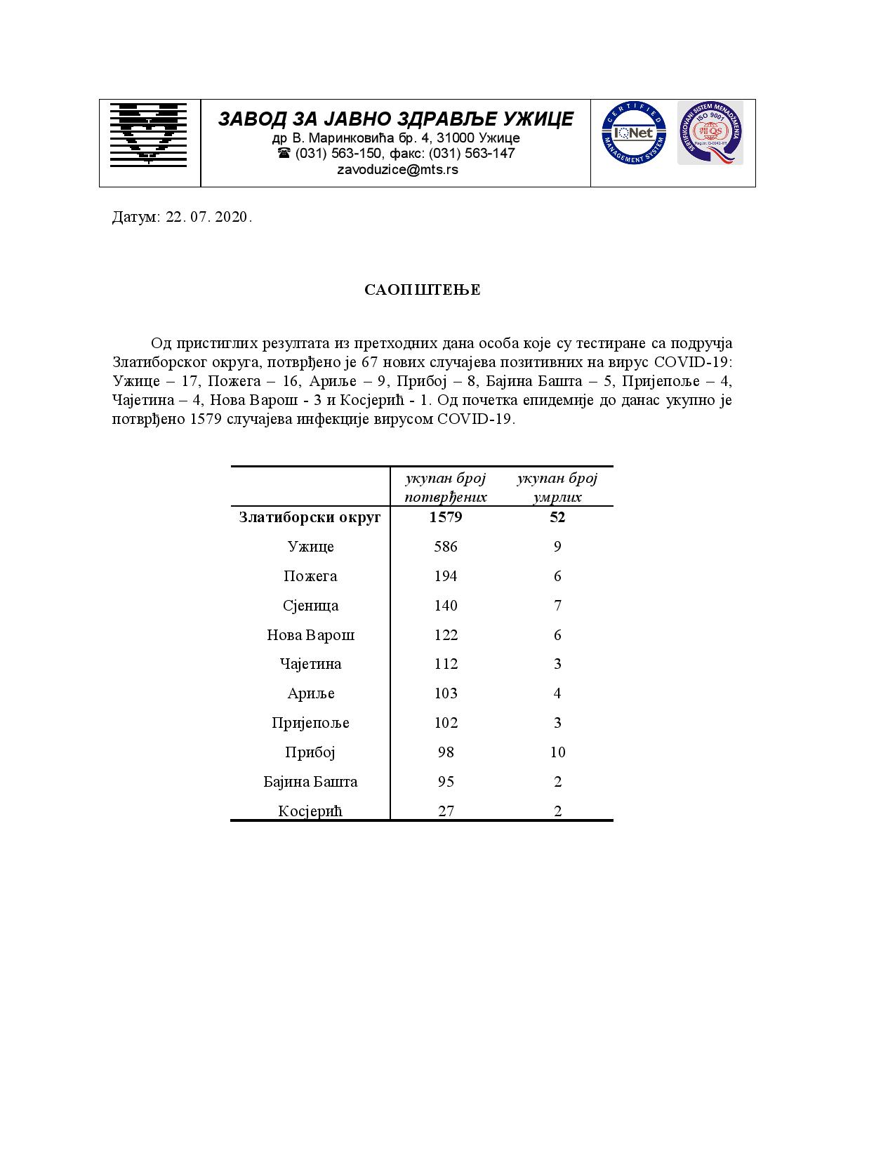 Златиборског округа, потврђенo је 67 нових случајева позитивних на вирус COVID-19: