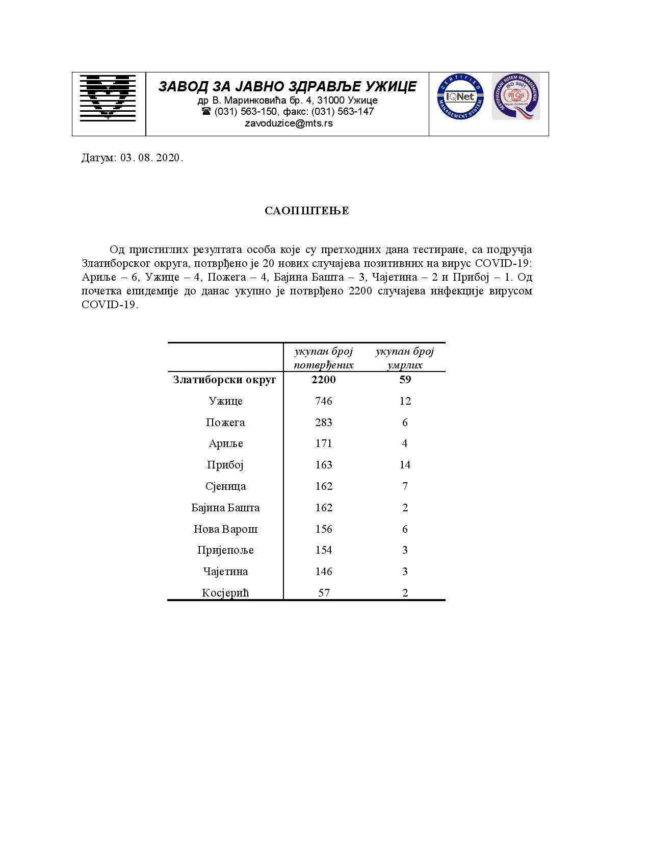 Златиборског округа, потврђенo је 20 нових случајева позитивних на вирус COVID-19: