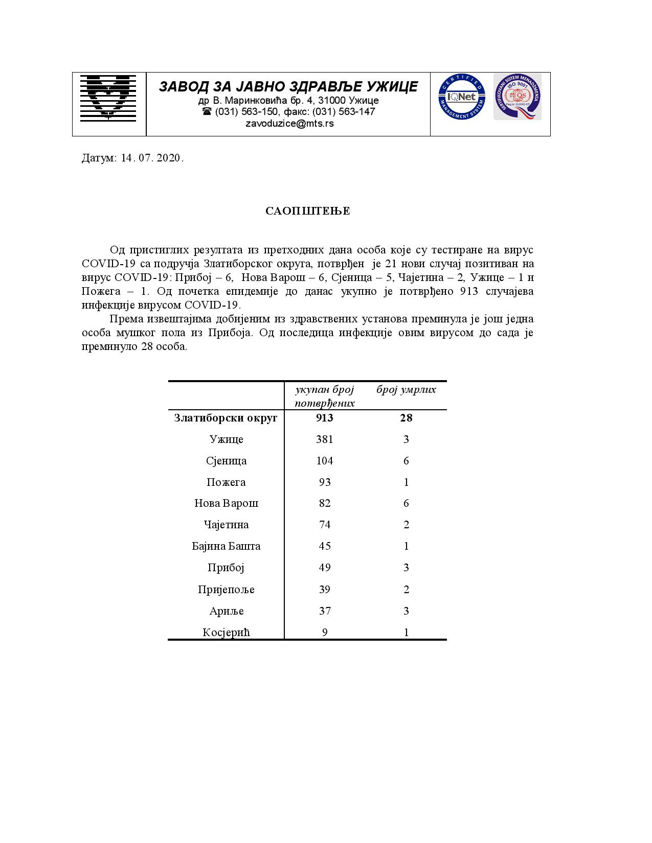 COVID-19 са подручја Златиборског округа, потврђен је 21 нови случај позитиван на